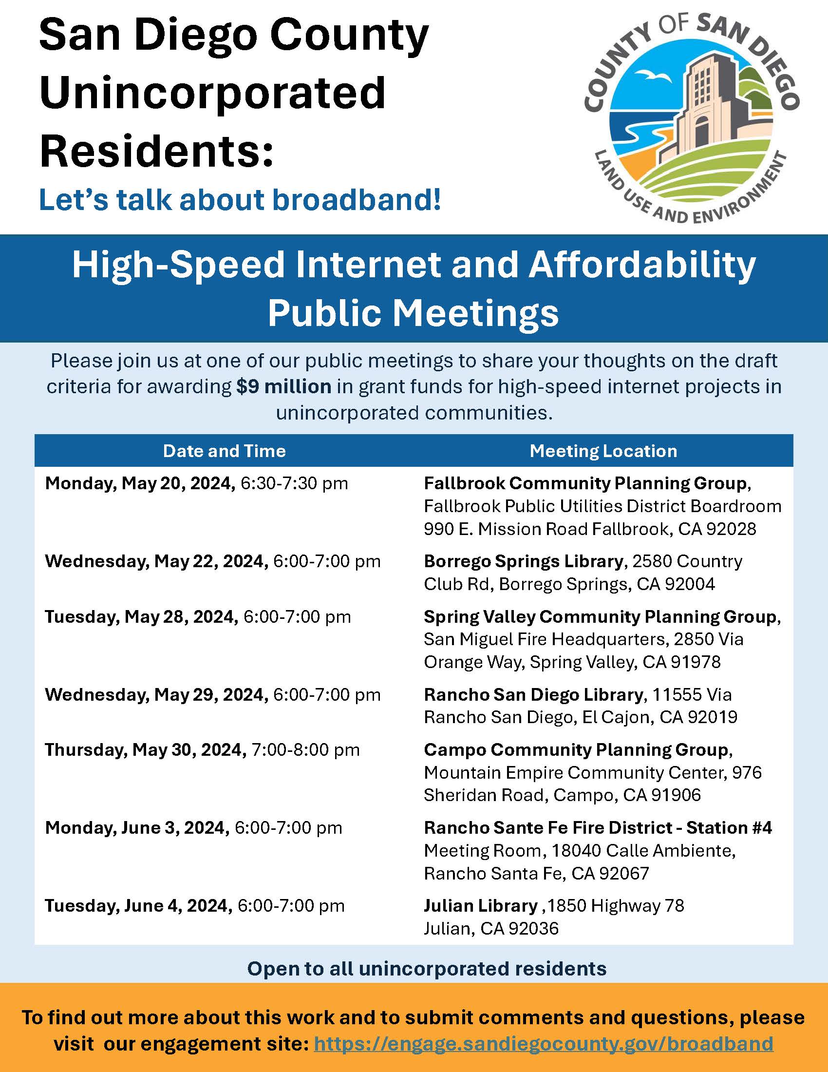 Join one of the public meetings to share thoughts on the draft criteria for awarding $9 million in grant funds for high-speed internet projects in unincorporated communities.