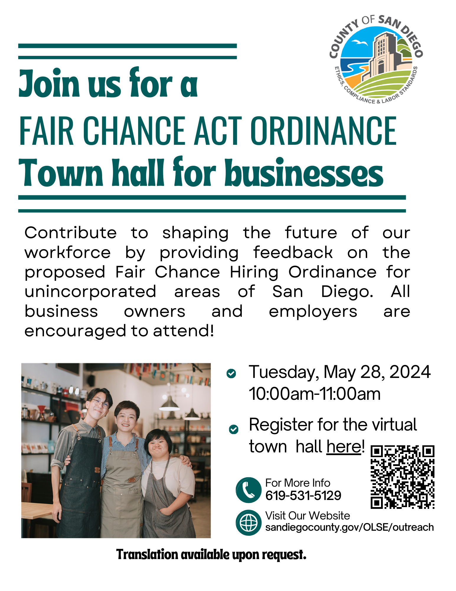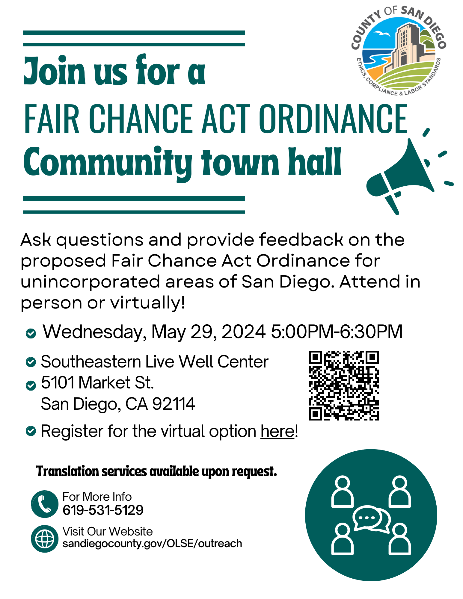 Ask questions and provide feedback on the proposed Fair Chance Ordinance for unincorporated areas of San Diego. Options to attend in person or virtually!