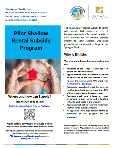 The Department of Homeless Solutions and Equitable Communities is pleased to announce that additional subsidies are now available through the County’s Pilot Shallow Rental Subsidy Program (SRSP) Round 2. The SRSP is designed to improve housing stability for low-income older adults who may be at risk of losing their housing. The SRSP Round 2 subsidies will provide $500 monthly payments to qualified households over a period of 18 months. Participants will also receive light case management services from the Department of Homeless Solutions and Equitable Communities. People eligible are head of households who are 55 years of age or older with the household income at or below 50% Area Median Income (AMI) and severely rent-burdened. A head of household who is 60 years of age or older with household income at or below 30% AMI and residing within one of the 39 Health Equity Zip Codes as defined by the Healthy Places Index may be prioritized for the program.