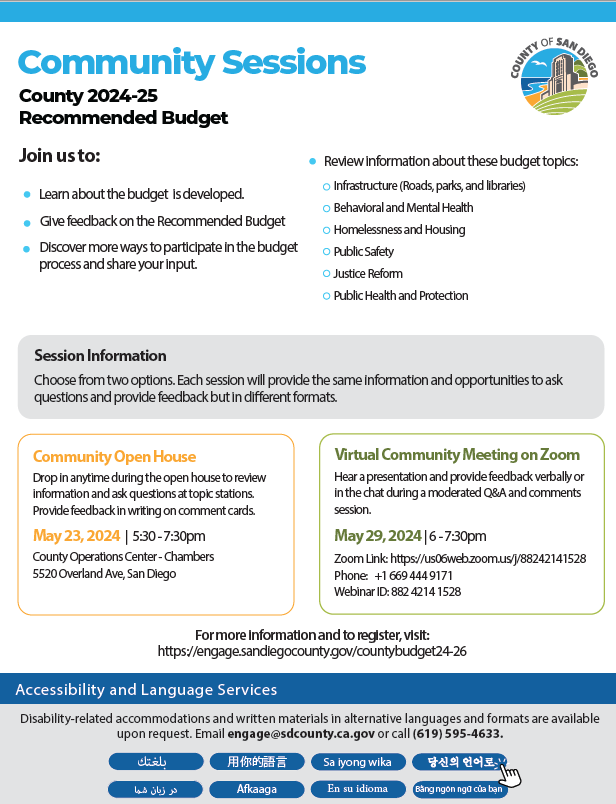 If you would like to attend, visit Engage San Diego County for all the session details. You can also register to let us know you are coming or request language and accessibility services.