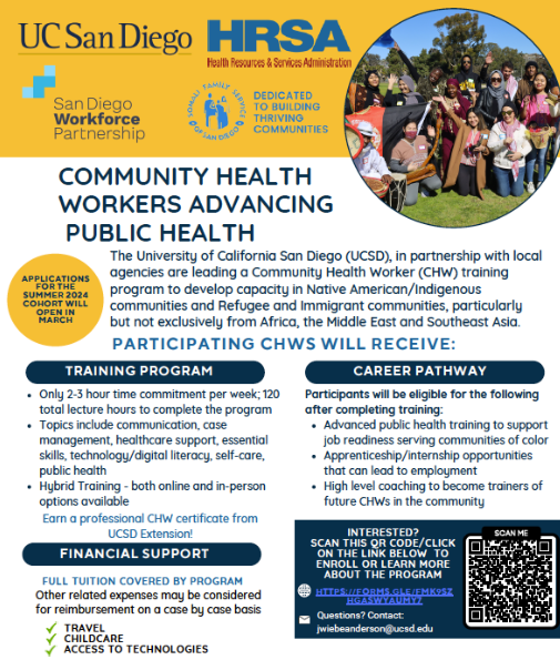 The University of San Diego, in partnership with local agencies, is leading a Community Health Worker training program to develop capacity in Native American/Indigenous communities and Refugee and Immigrant communities, particularly but not exclusively from Africa, the Middle East, and Southeast Asia.