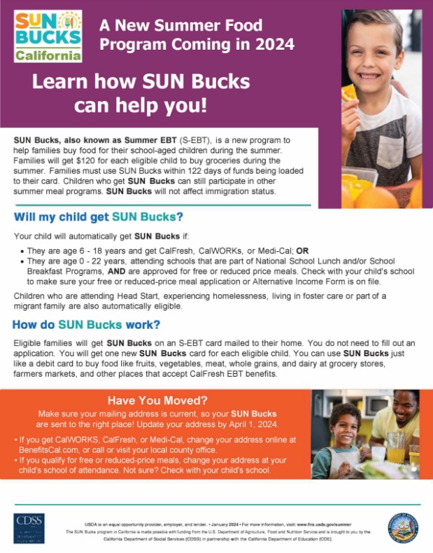 SUN Bucks, also known as Summer EBT (S-EBT), is a new permanent program that helps families with school-age children buy groceries during the summer when kids might not have access to school meals. Families will get $120 for each eligible child to buy groceries during the summer. Families must use SUN Bucks within 122 days of funds being loaded onto their card. Children who get SUN Bucks can still participate in other summer meal programs.