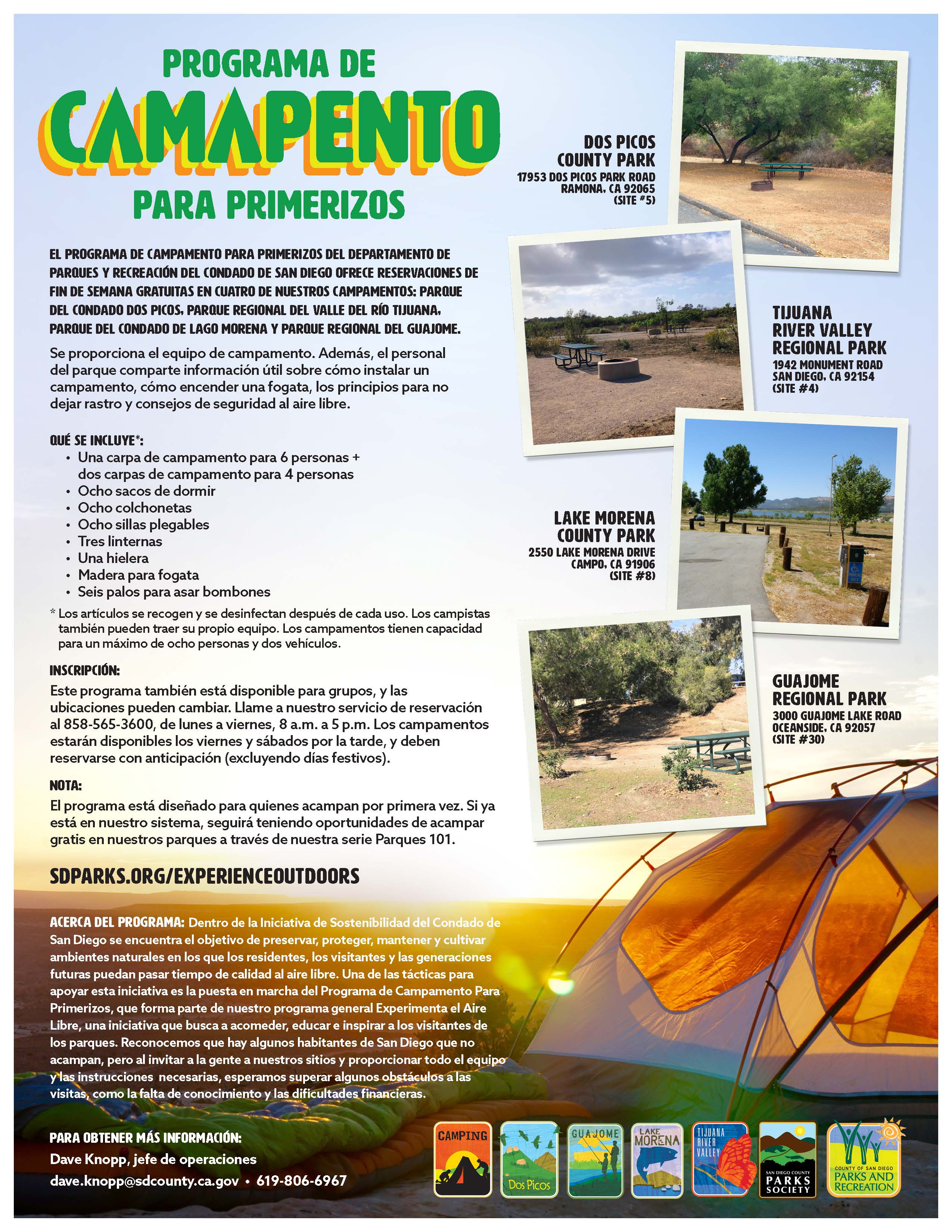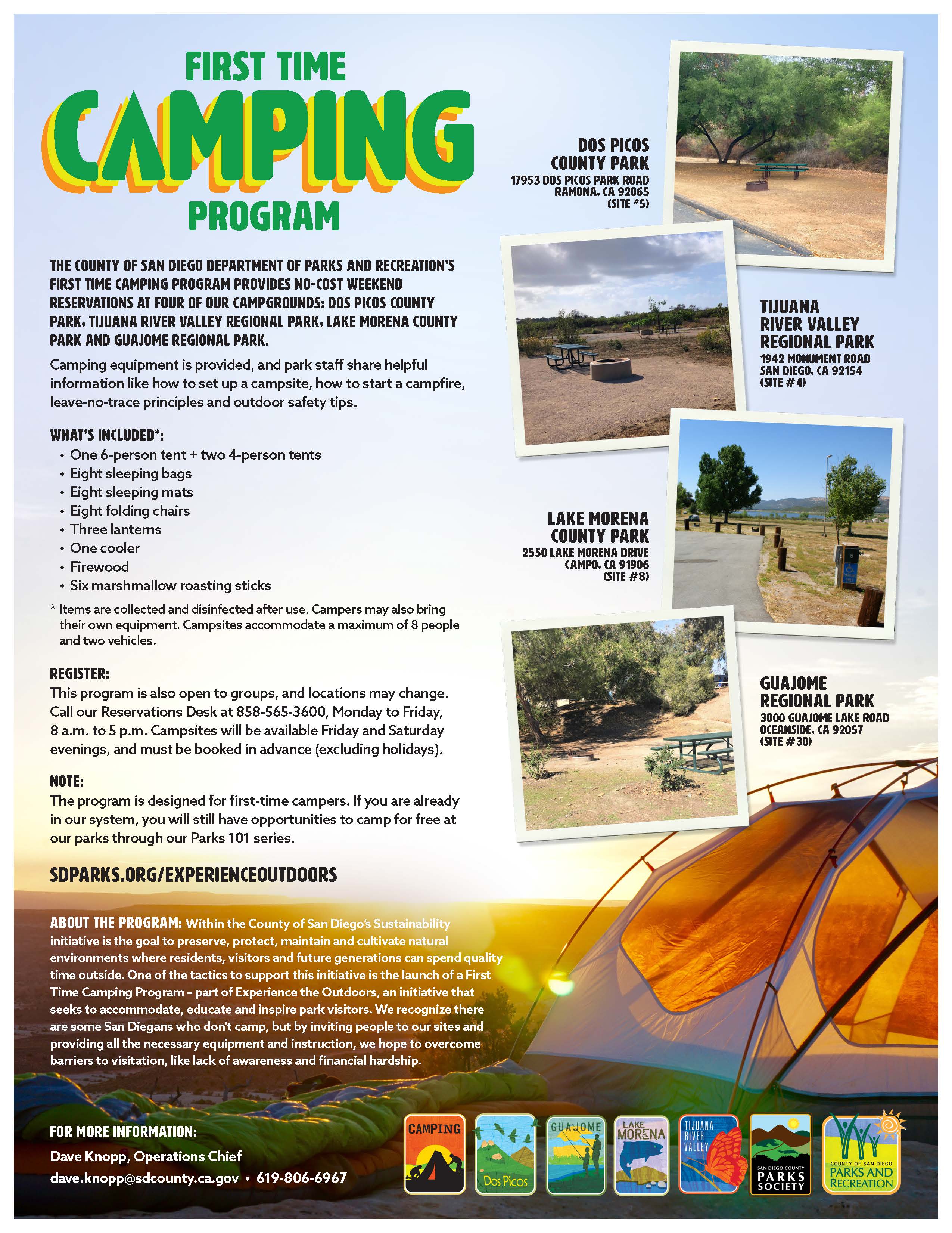 The County of San Diego Department of Parks and Recreation's First Time Camping Program provides no-cost weekend reservations at four campgrounds: Dos Picos County Park, Tijuana River Valley Regional Park, Lake Morena County Park, and Guajome Regional Park.