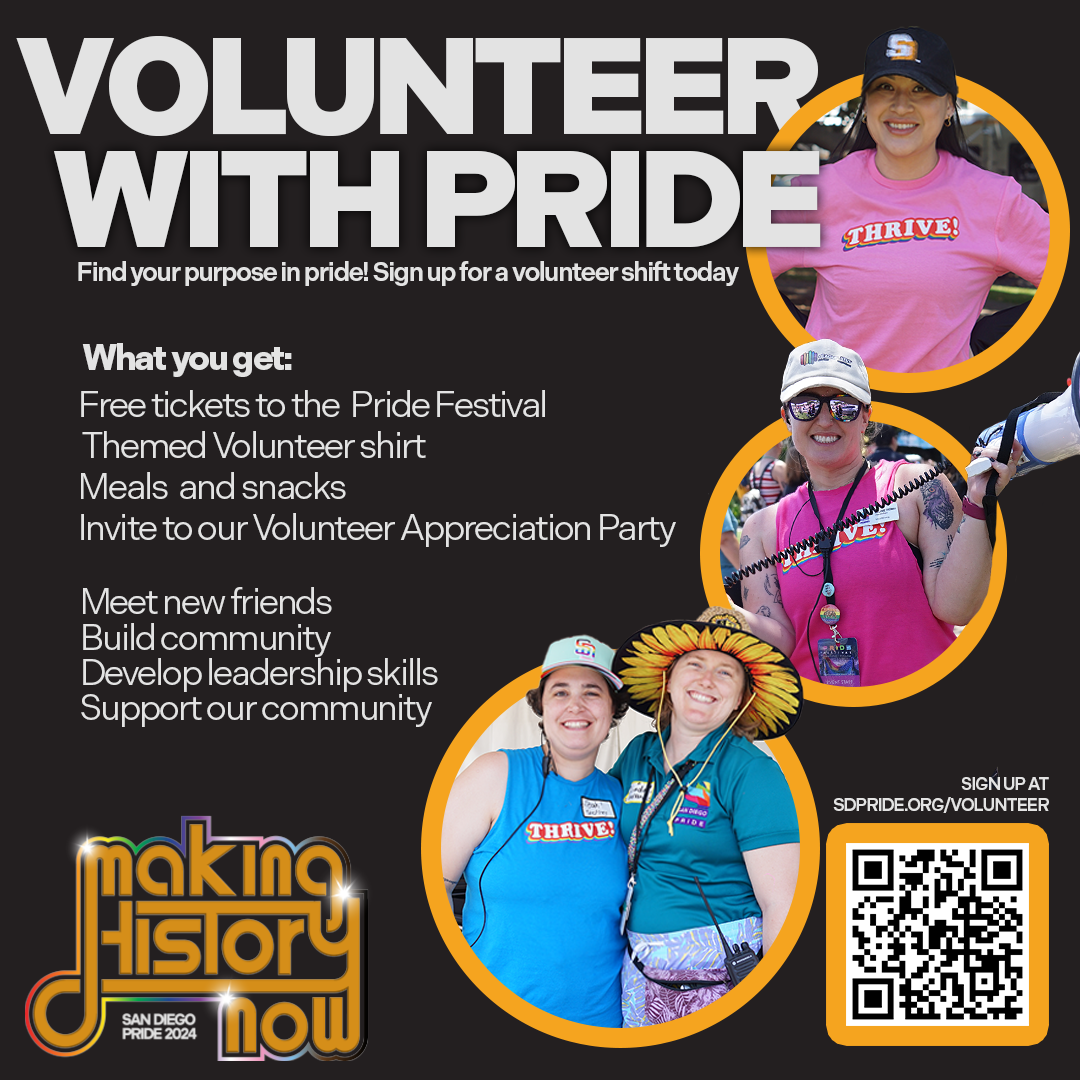 Every year, San Diego Pride relies on over 2,000 volunteers to help us plan and execute the Pride Festival, events, and programs. With over 30 different volunteer departments, there is something for everyone!