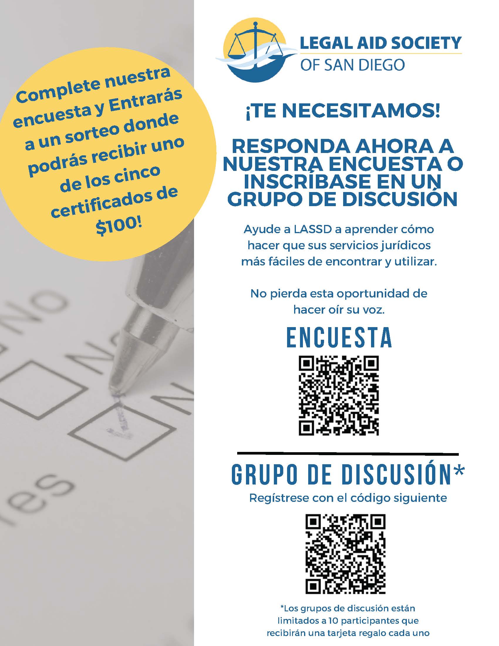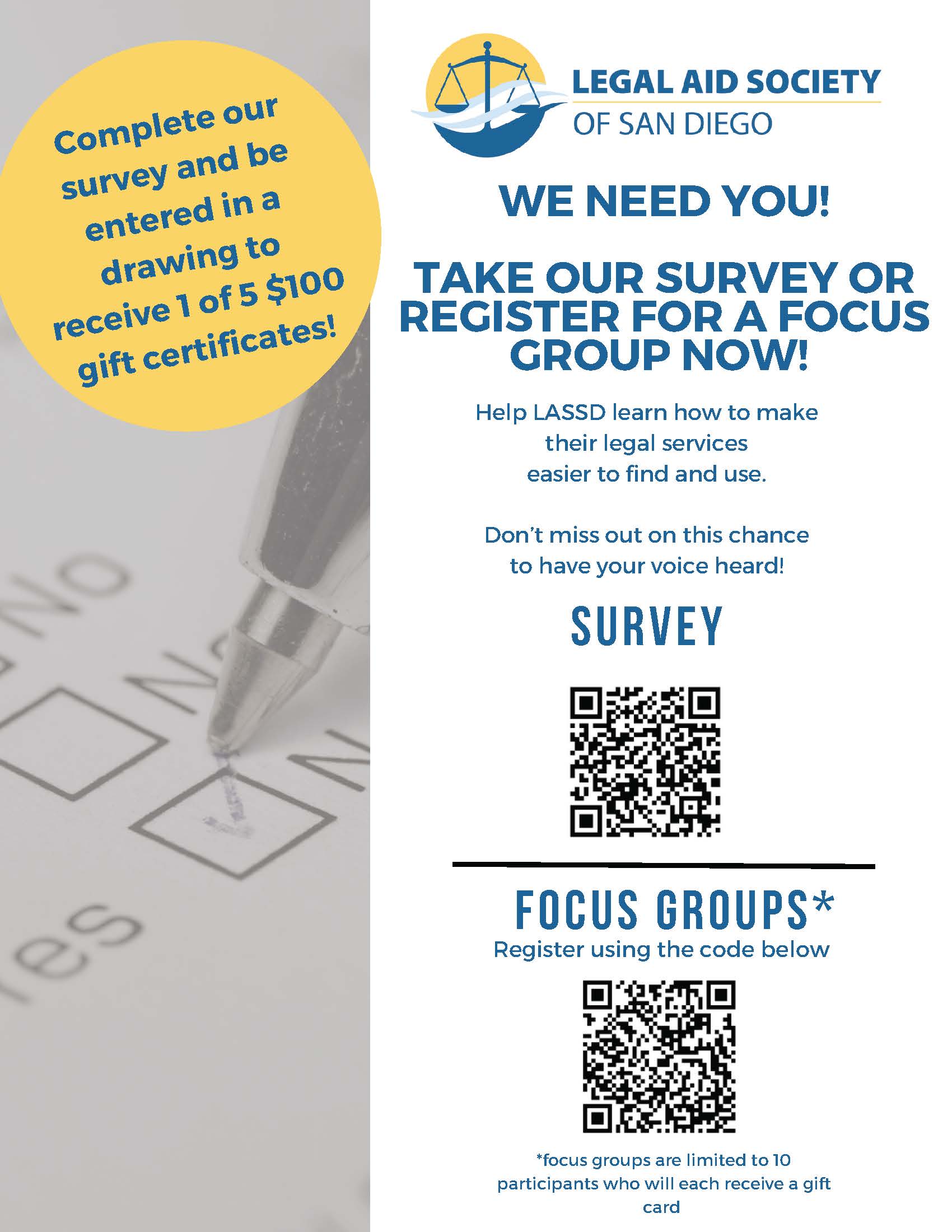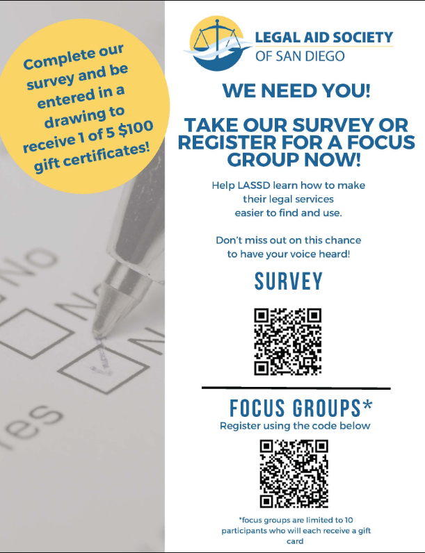 The Legal Aid Society of San Diego (LASSD) is looking for participants to fill out their survey. Completing the survey allows LASSD to learn how to make their legal services easier to find and use.