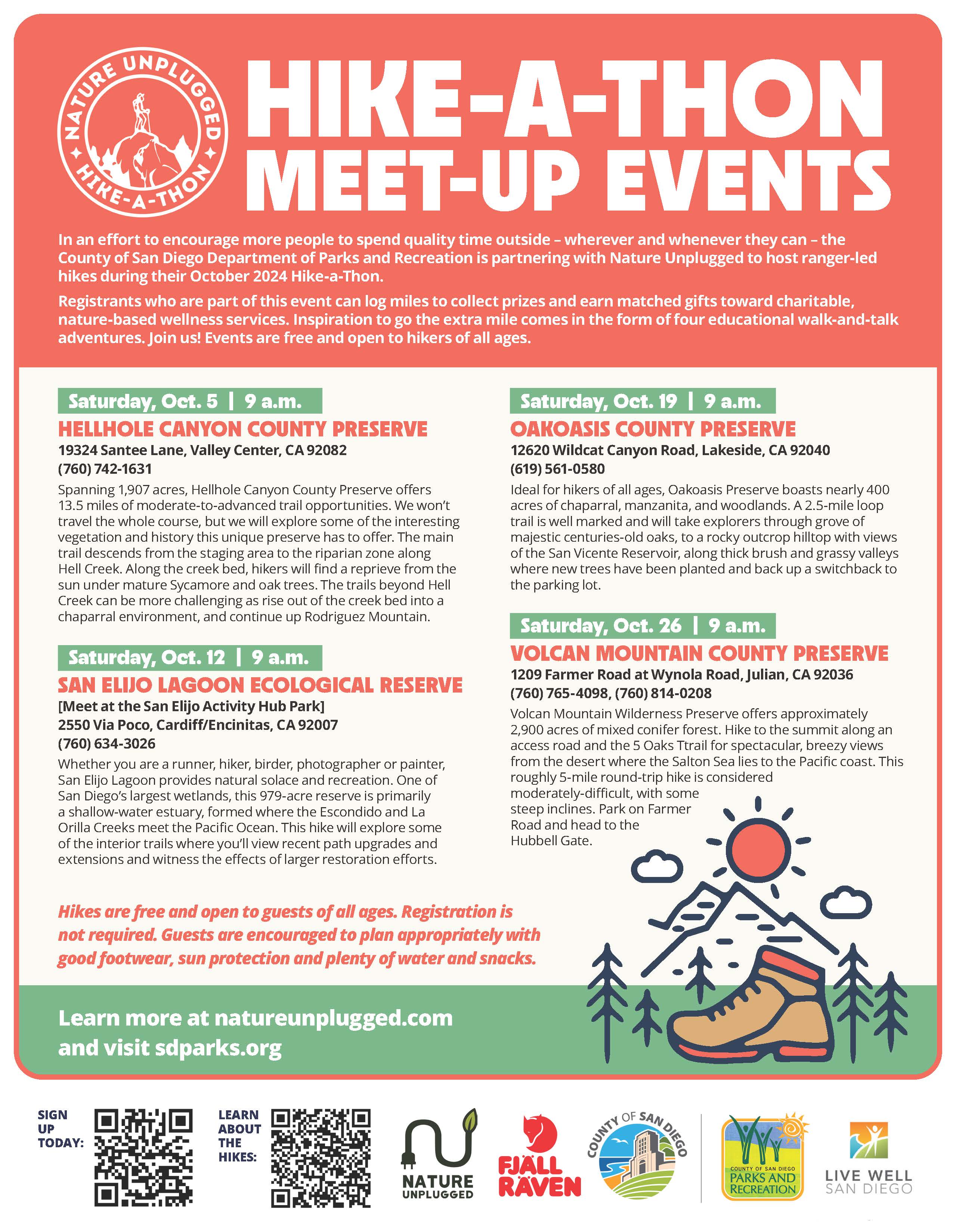 In an effort to encourage more people to spend quality time outside, wherever and whenever they can - the County of San Diego Department of Parks and Recreation is partnering with Nature Unplugged to host ranger-led hikes during their October 2024 Hike-a-thon.