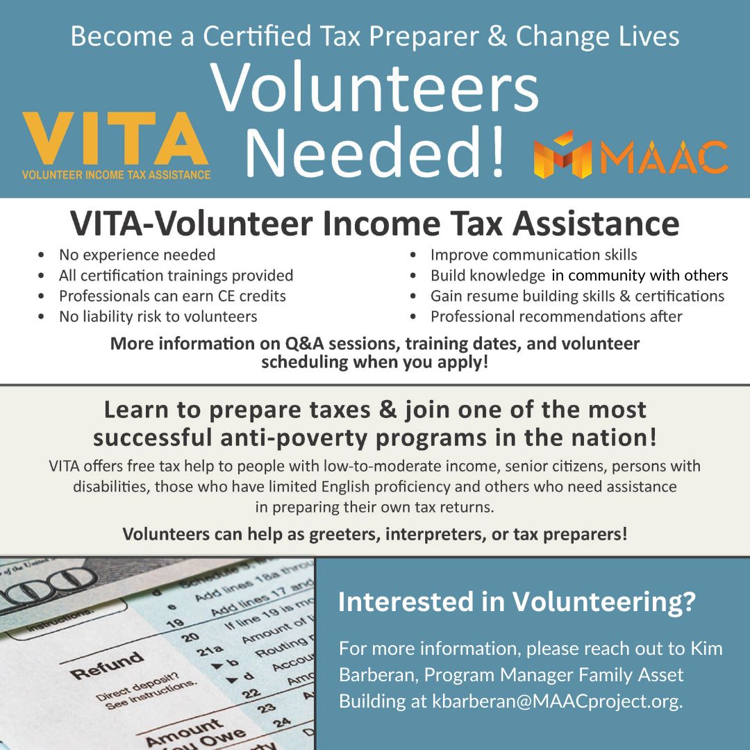 Learn to prepare taxes and join one of the most successful anti-poverty programs in the nation. VITA Offers free tax help to people with low-to-moderate income, senior citizens, persons with disabilities, those who have limited English proficiency, and others who need assistance in preparing their own tax returns.
