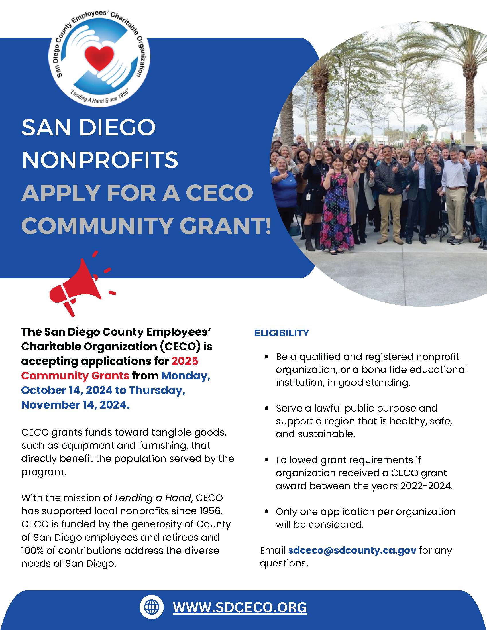 The San Diego County Employees’ Charitable Organization (CECO) is accepting applications for 2025 Community Grants!