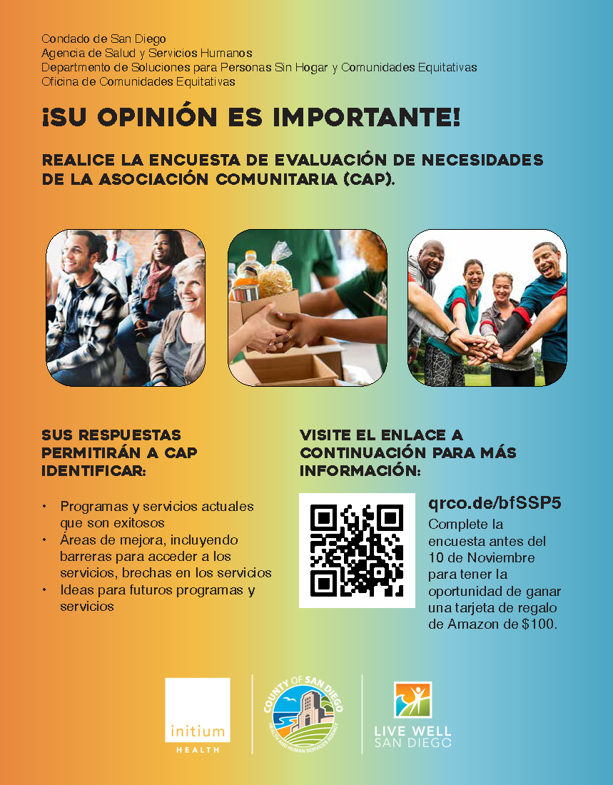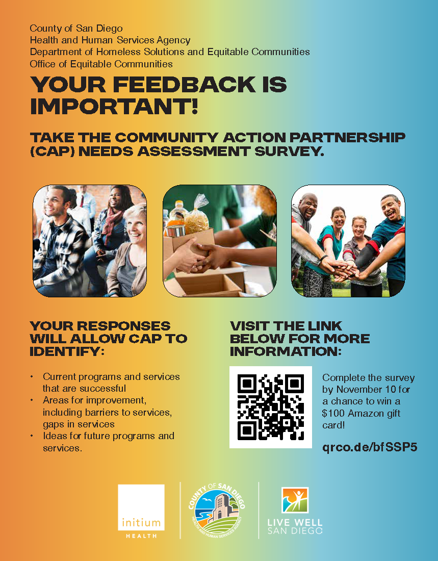 Through November 10, Initium Health and Community Action Partnership (CAP) are hosting an anonymous countywide survey and in-person Ideas Exchange meetings to gather input from key community sectors, especially low-income residents. CAP empowers economically disadvantaged communities to achieve the "Live Well San Diego" vision, supporting families earning 125% or less of the federal poverty level. Your participation can help identify the causes of poverty and drive meaningful change.