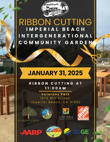 Join the County of San Diego, City of Imperial Beach, Aging and Independence Services, San Diego Gas & Electric, AARP, SD Children & Nature, and the Master Gardener Association on January 31, 2025, at 11:00 AM for ribbon cutting and opening of the community garden. Light refreshments will be served.