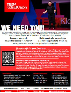 Cajon Valley Union School District is looking for mentors to assist their students prepare for their TEDx talks in the Spring. This is a short commitment to listen to a student after a short training and then follow-up with encouraging words before their presentation. If you are interested, please see the flyer and reach out to Carol Lewis: carol.lewis@elcajoncollaborative.org