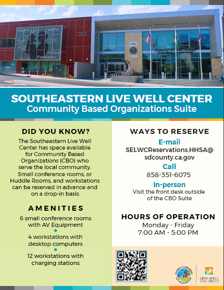 The Southeastern Live Well Center provides a single stop for services and serves as a hub for collaboration. The Community Based Organizations (CBO) Suite is available at no cost to CBOs who serve the community. Call, email, or visit to reserve a workspace or huddle room. Reservations are available Monday – Friday from 7:00 AM – 5:00 PM