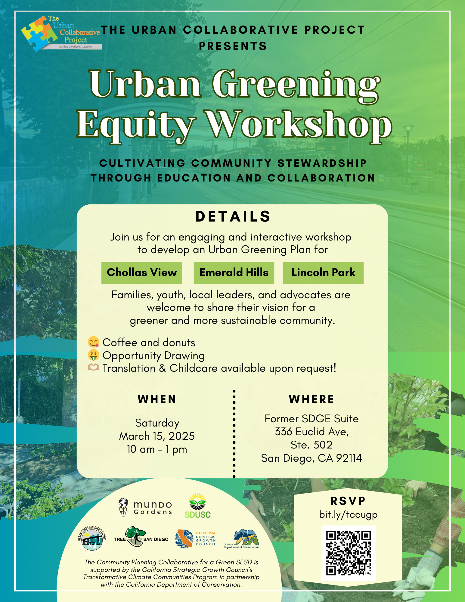 Join us for an engaging and interactive workshop to develop an Urban Greening Plan for Chollas View, Emerald Hills, and Lincoln Park.