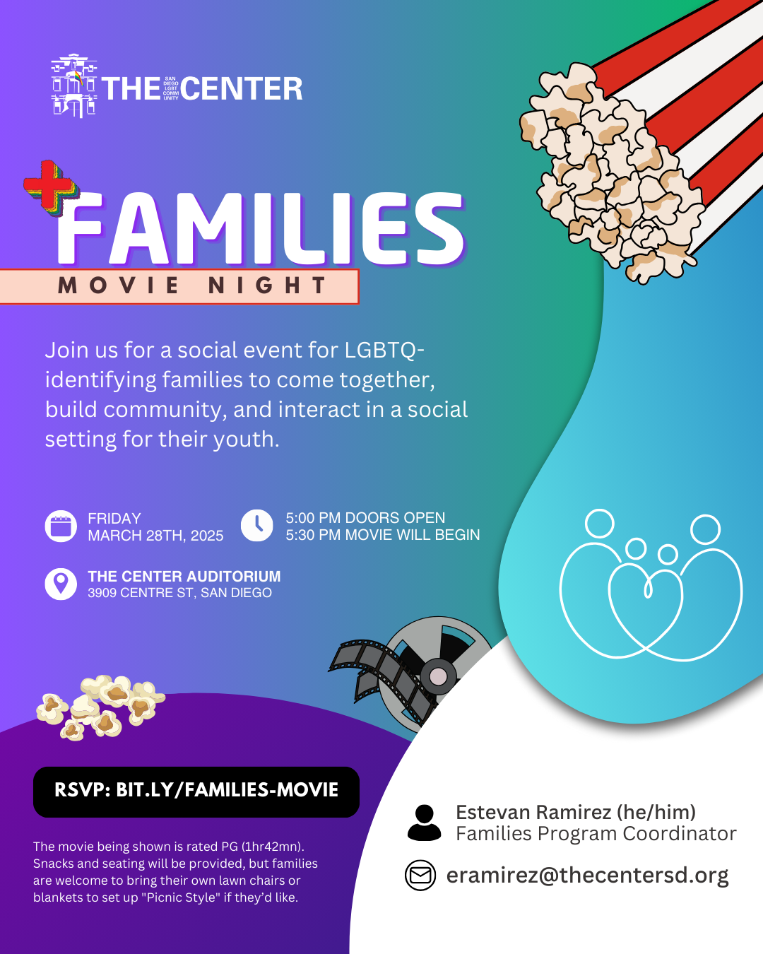 Join The Center SD for a social event for LGBTQ-identifying families to come together, build community, and interact in a social setting for their youth. The movie being shown is rated PG (1h35m). Snacks and seating will be provided, but families are welcome to bring their own lawn chairs or blankets to set up “Picnic Style” if they’d like.