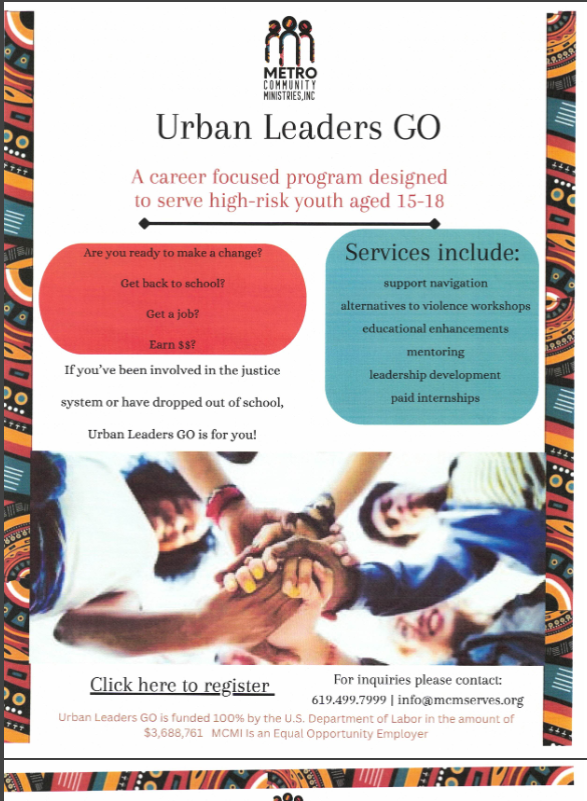 Urban Leaders Go - A career focused program designed to serve high-risk youth ages 15-18. Services include support navigation, alternatives to violence workshops, educational enhancements, mentoring, leadership development, and paid internships.