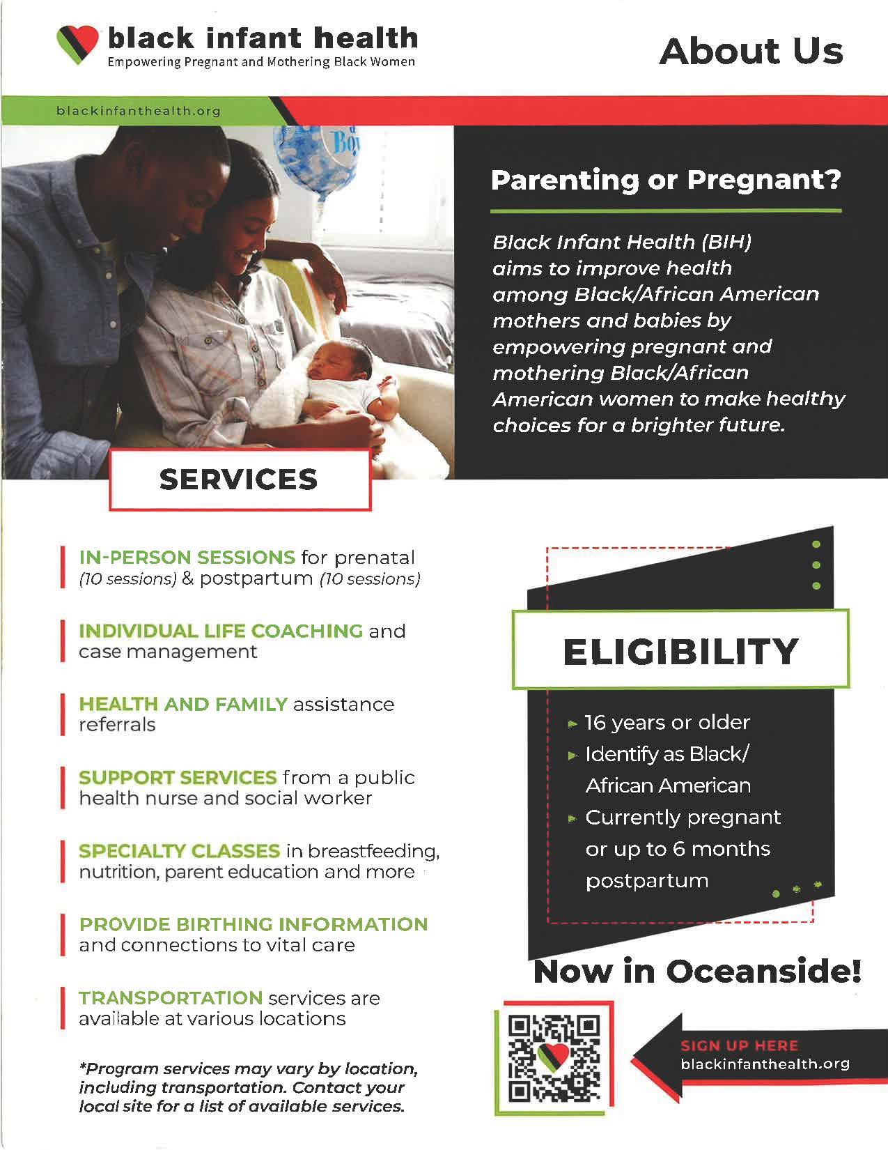 The San Diego County Black Infant Health Program (BIH) is a FREE supportive service for pregnant women and new mothers who are at least 16 years of age and self-identify as Black or African American. BIH aims to improve health among eligible mothers and babies by empowering pregnant and mothering, Black/African American moms to make healthier choices for a brighter future. BIH accepts participants at any stage of pregnancy and up to 6 months post-partum, regardless of income.