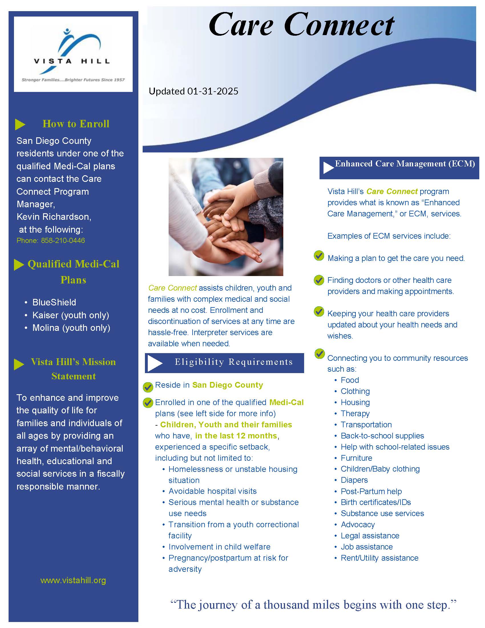 Vista Hill is a community-based, dynamic non-profit organization. Vista Hill maintains a diverse array of quality services and programs throughout San Diego County, assisting underserved, challenged children, teens, adults, and families. Their three areas of focus are intellectual & developmental disabilities, substance use disorder, and mental illness.