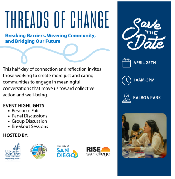 The County of San Diego, in collaboration with the Nonprofit Institute at the University of San Diego, City of San Diego, and RISE San Diego, is hosting an Equity Summit: “Threads of Change: Unraveling Barriers, Weaving Community, and Bridging our Future.” The Equity Summit will be held on Friday, April 25, from 10 PM - 3 PM, at the Balboa Park Club, in the ballroom (2150 Pan American W Rd, San Diego, CA 92101).