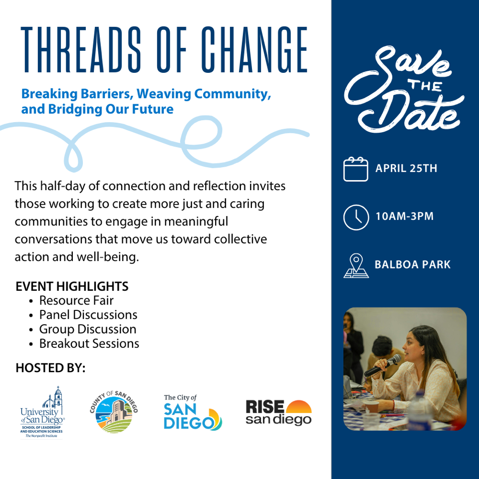 The County of San Diego, in collaboration with the Nonprofit Institute at the University of San Diego, City of San Diego, and RISE San Diego, is hosting an Equity Summit: “Threads of Change: Unraveling Barriers, Weaving Community, and Bridging our Future.” The Equity Summit will be held on Friday, April 25, from 10:00 PM to 3:00 PM, at the Balboa Park Club, in the ballroom (2150 Pan American W Rd, San Diego, CA 92101).