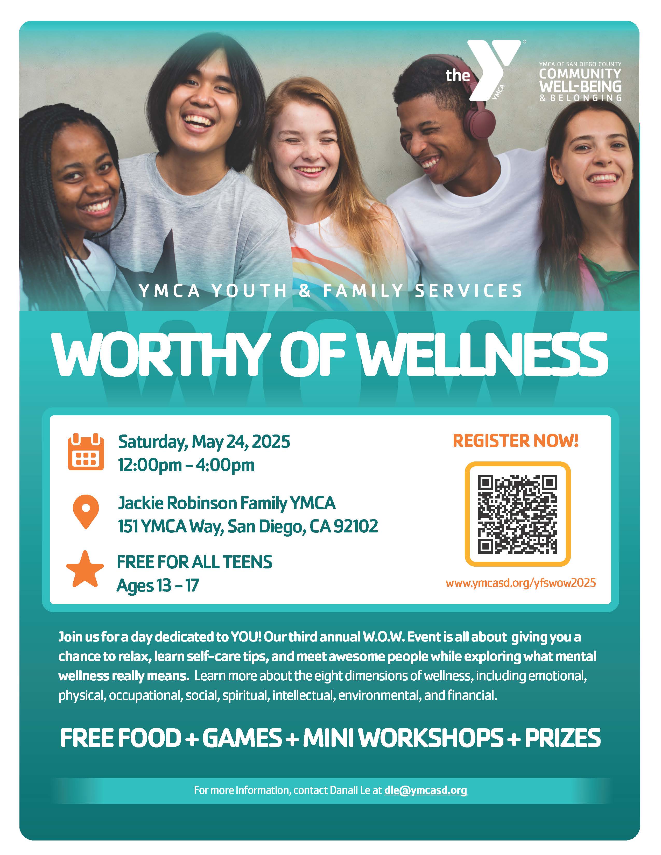YMCA Youth and Family Services invites teens (ages 13–17) to the third annual W.O.W. – Worthy of Wellness event! Discover what mental wellness truly means while exploring the eight dimensions of wellness: emotional, physical, occupational, social, spiritual, intellectual, environmental, and financial. Enjoy self-care activities, connect with peers, and have fun—all for free!