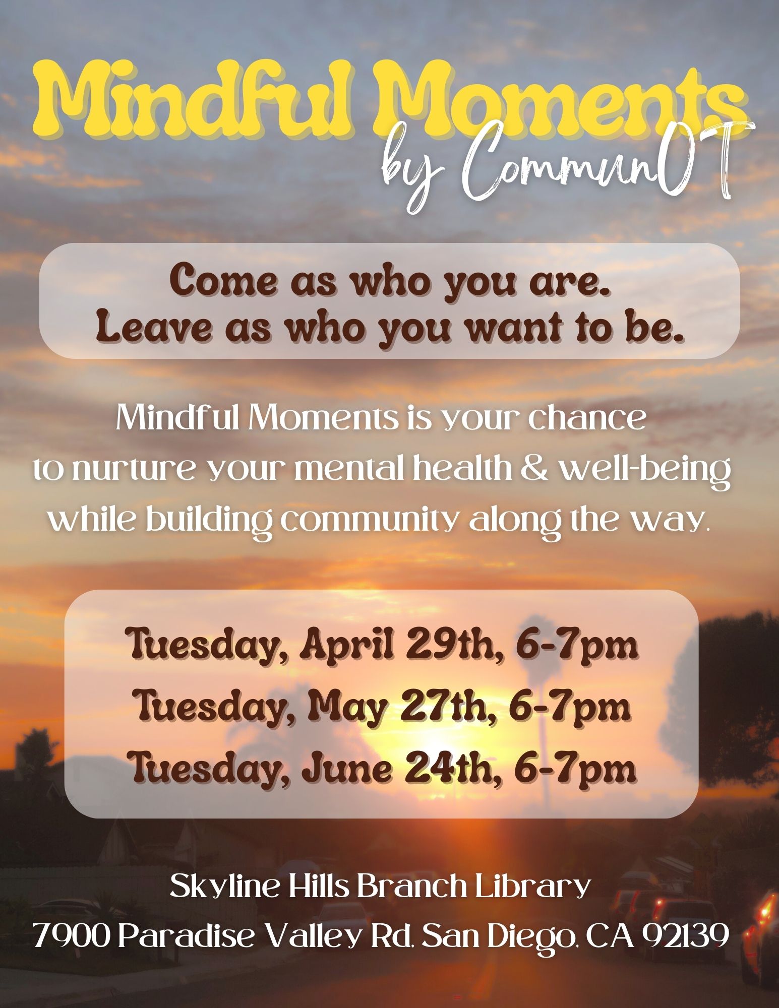Join CommunOT for Mindful Moments, a monthly mental health and wellness gathering featuring therapeutic practices and a relaxing sunset sound bath. Learn accessible self-care techniques while building community in a calm, welcoming environment. Hosted the last Tuesday of every month, this free group is designed to support mental health access in Southeast San Diego.