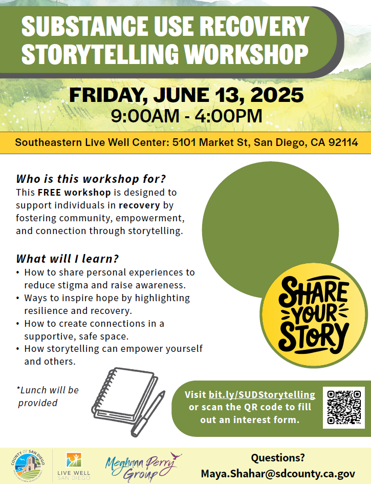 Free Storytelling Workshop! This event is designed for individuals in recovery from substance use who want to explore the power of storytelling as a tool for healing, connection, and empowerment. Participants will learn how to share their experiences to reduce stigma, inspire hope, and foster community. Lunch will be provided.
