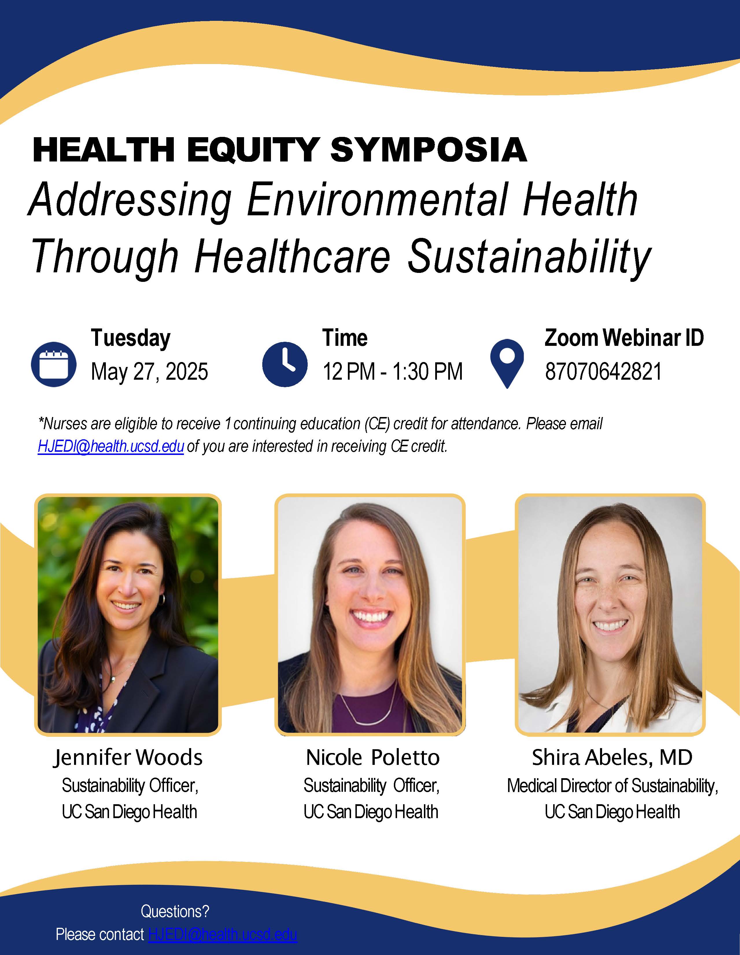 The Department of Health JEDI at UC San Diego Health is hosting health equity symposia for our health system, internal and external partners, and collaborators. Shira Abeles, MD, Nicole Poletto, and Jennifer Woods will present on Addressing Environmental Health Through Healthcare Sustainability.