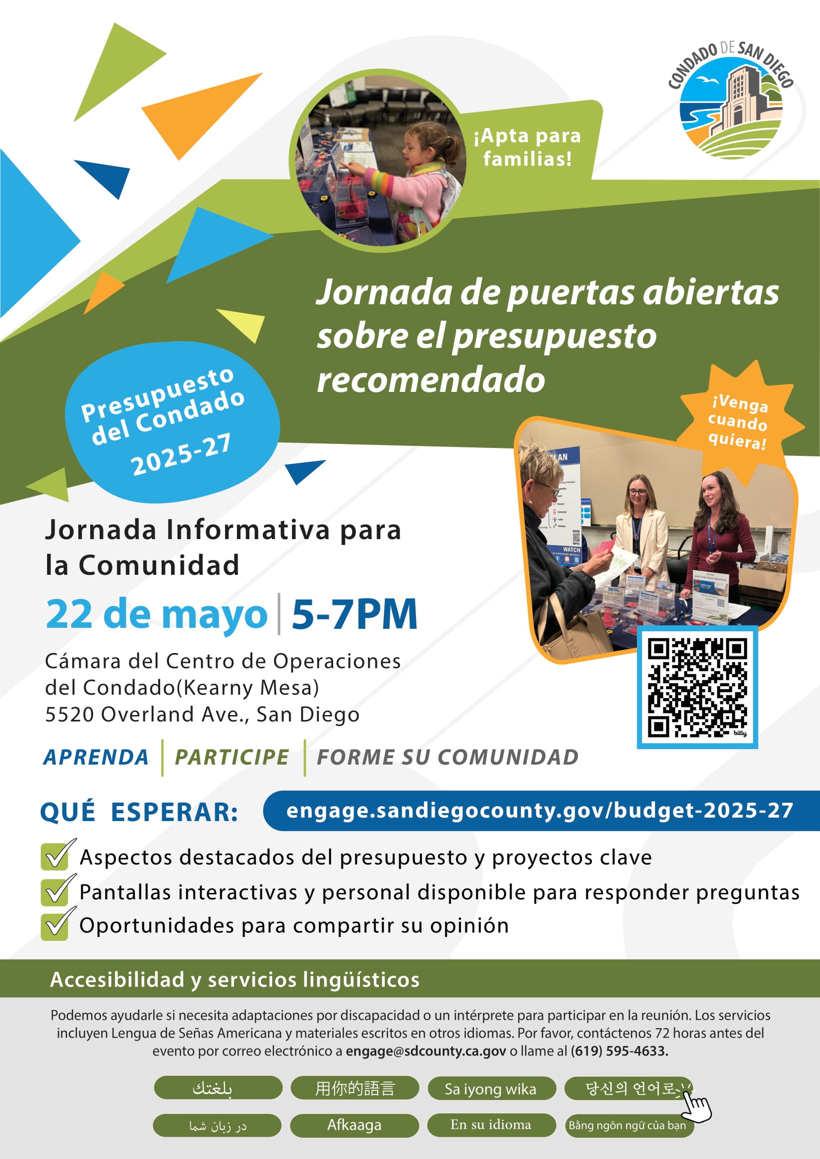 You may also leave budget comments online at Engage San Diego County now until 5 p.m. on June 12. The new budget will take effect July 1!