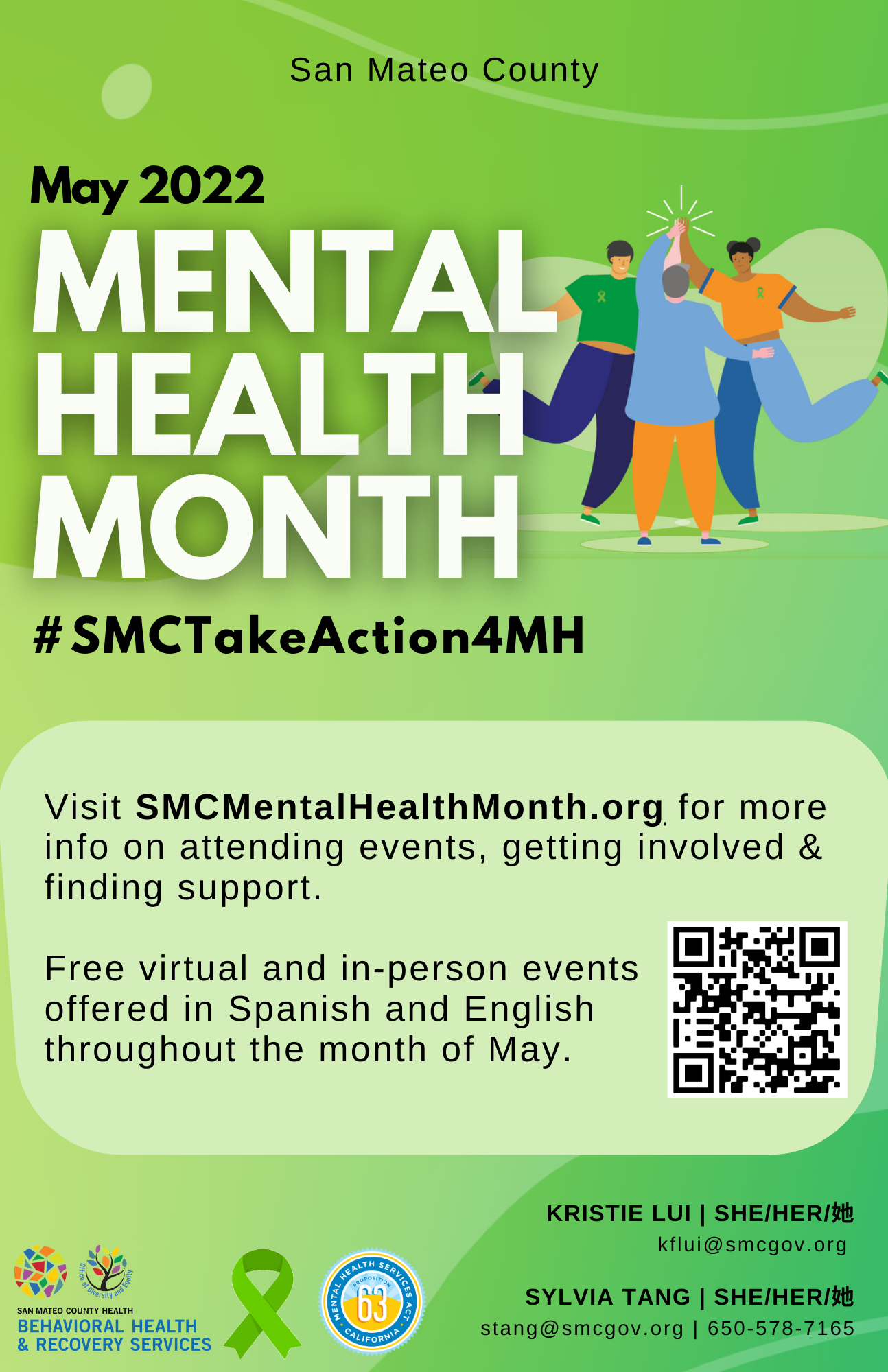 As many of you know, May is Mental Health Month or, as we also like to call it, the lime greenest time of the year! This year’s theme, adopted from the statewide campaign, is #SMCTakeAction4MH. The theme encourages everyone to take actionable steps to address mental health and substance use matters. Over the past two years, the pandemic has been especially challenging for many of us. Your mental health is more important than ever. Throughout the month, learn ways you can take action to improve your communities’ mental wellness!