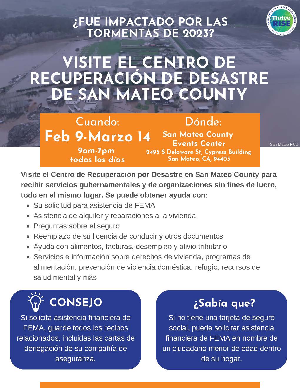 AVISO: Solicite asistencia de FEMA. Fecha final para pedir solicitud es el 16 de marzo. El Centro Local de Recuperación de Desastres permanecerá abierto en el Centro de Eventos del Condado de San Mateo hasta el 14 de marzo. El horario de atención es de 9 a.m. a 5 p.m. todos los días (Cerrado el Domingo, 12 de marzo). Nota: el centro cerrará a las 5 pm el martes, 14 de marzo. Visite aquí para más información; https://www.disasterassistance.gov/.