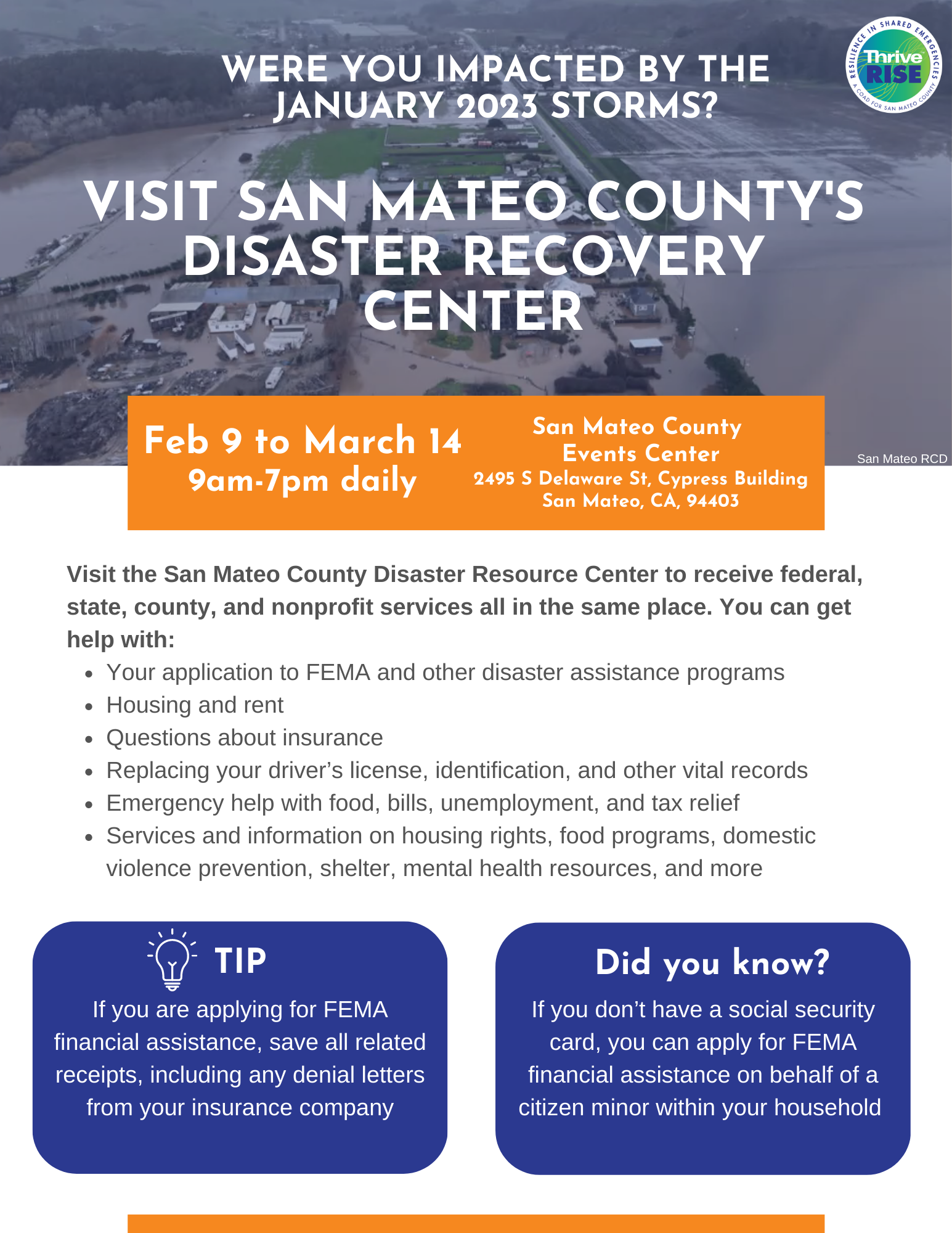 NOTICE: Apply for FEMA assistance. Application deadline is March 16thThe Local Disaster Recovery Center will remain open at the San Mateo County Event Center through March 14th. The hours of operation are open from 9 a.m. to 5 p.m. daily (Closed Sunday, March 12). Note: the center will close at 5 p.m. on Tuesday, March 14. Visit here for more information; https://www.disasterassistance.gov/.