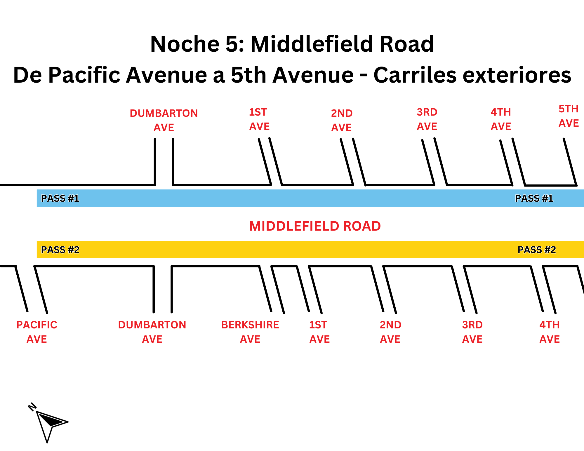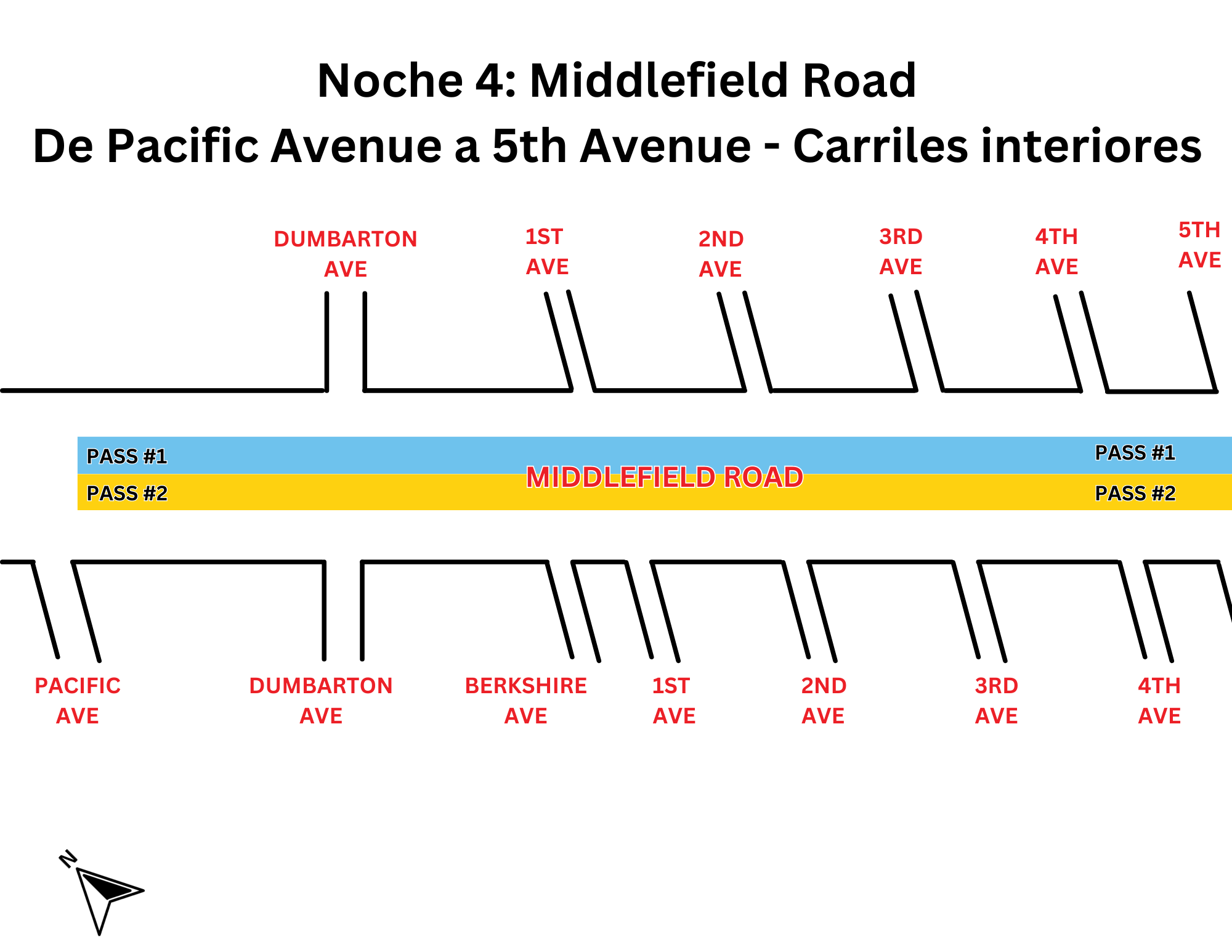 - El acceso a Middlefield Road desde todas las calles laterales entre Pacific Avenue y 5th Avenue estará cerrado al tráfico.