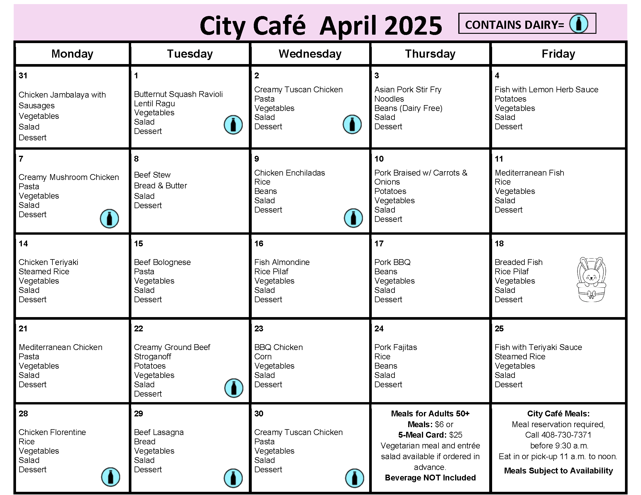 The Senior Center lunch program offers lunch meals, Monday through Friday, by reservation only. Make your reservation one day in advance or the same day before 9:30 a.m. by calling 408-730-7371.