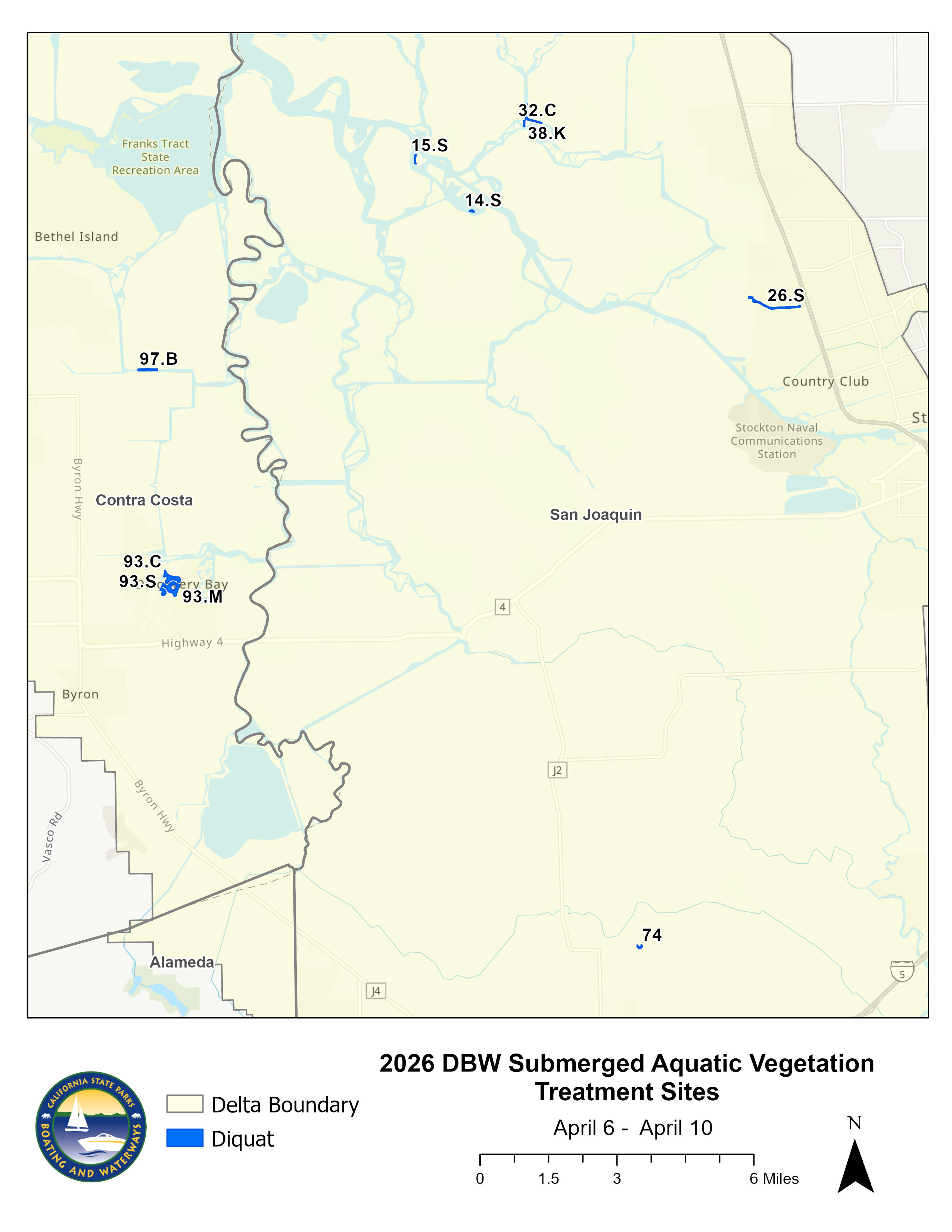 The State Division of Boating and Waterways will be applying aquatic invasive vegetation treatments this week at the following sites, subject to change based on regulatory requirements, weather conditions, plant growth and movement, waterway traffic, listed fish presence surveys, and other conditions: