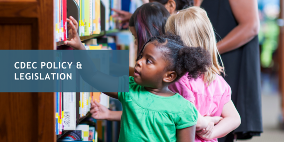 Children selecting books from a library shelf. Text on teal overlay reads, "CDEC Policy & Legislation."