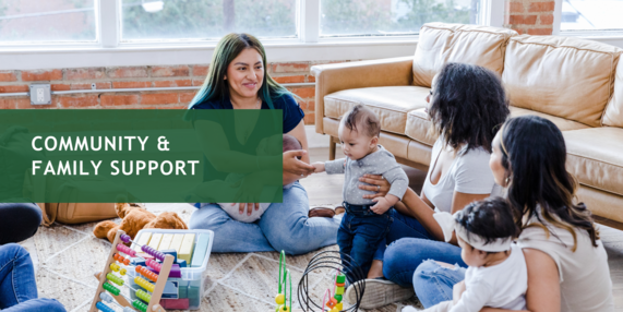 Women and children sitting on the floor in a brightly lit room playing with toys. Text on green overlay reads, "Community & Family Support."