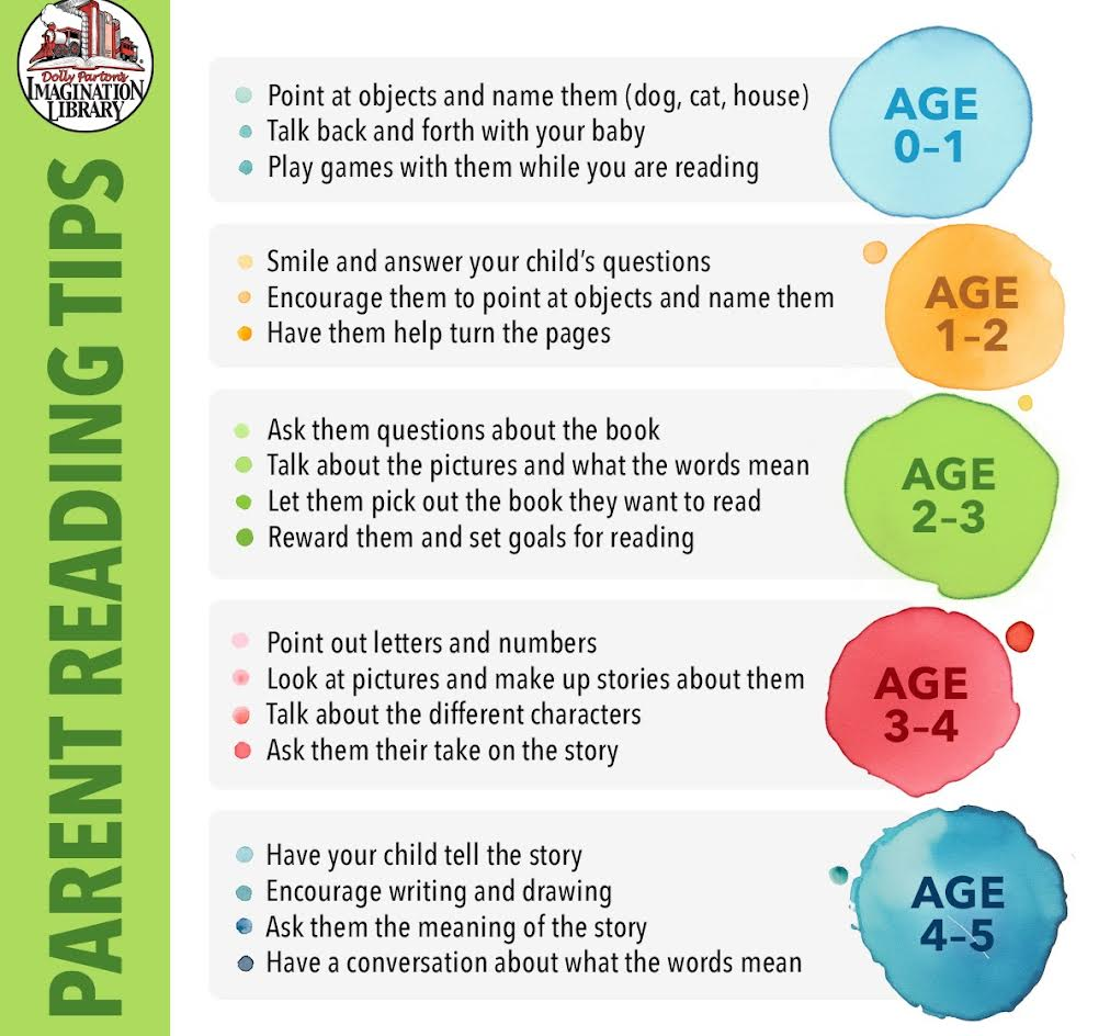 Colorful infographic with reading tips for parents from the Dolly Parton's Imagination Library, organized by age group.