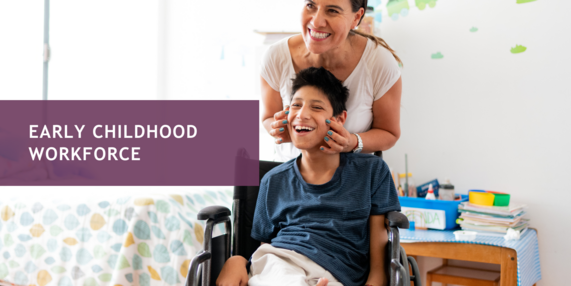 A smiling young person in a wheelchair with a therapist behind them, both smiling, in a bright room. Text on purple overlay reads, "Early Childhood Workforce."