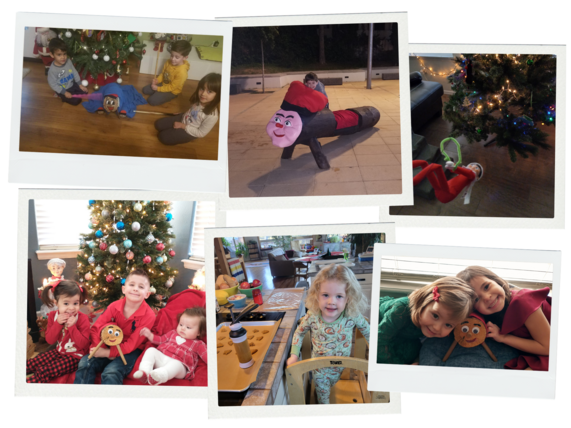 A collage of festive scenes with children, Christmas trees, and traditional log figures.