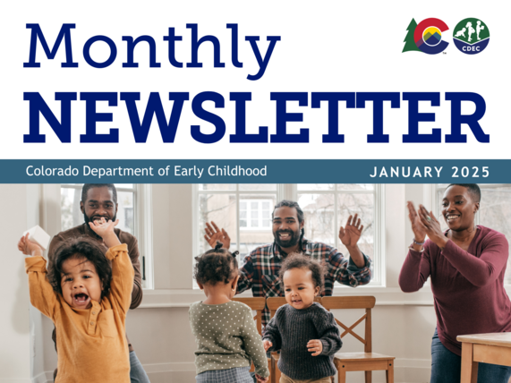 Newsletter cover for January 2025 featuring the Colorado Department of Early Childhood, displaying a group of joyful adults and children indoors.