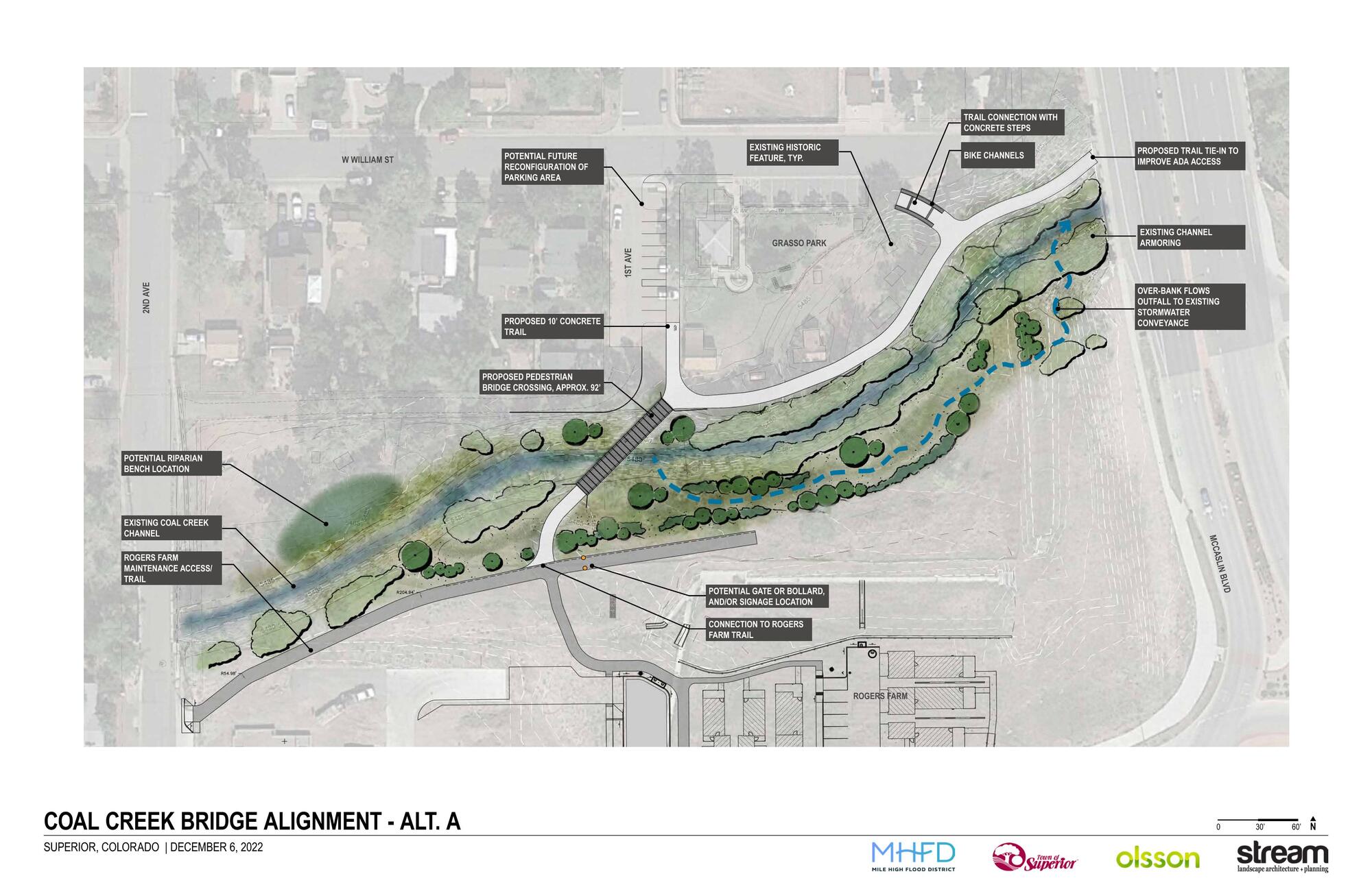 The Coal Creek Pedestrian Bridge Project, a partnership with the Mile High Flood District (MHFD), will connect the Coal Creek Trail and the Mayhoffer-Singletree Trail. Design plans were approved by the Superior Town Council earlier this year.