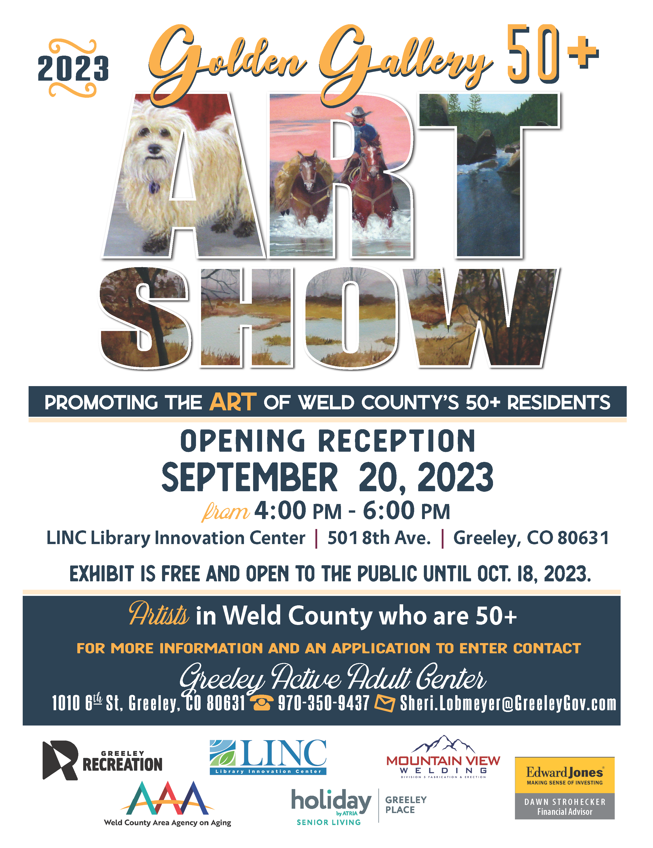 Attention all art enthusiasts, the Golden Gallery Art Show is back for its 6th year! The show promotes the art of Weld County 50+ residents and their wonderful artistic abilities. The exhibit and reception are free and open to the public. The Art Show opening reception will be at LINC Library, 501 8th Avenue in Greeley, on Wednesday, September 20 from 4-6 p.m. The exhibit will be open to the public September 20 through October 18. Please join us for the opening reception, or make your way over for the show to enjoy some truly fantastic pieces of art.