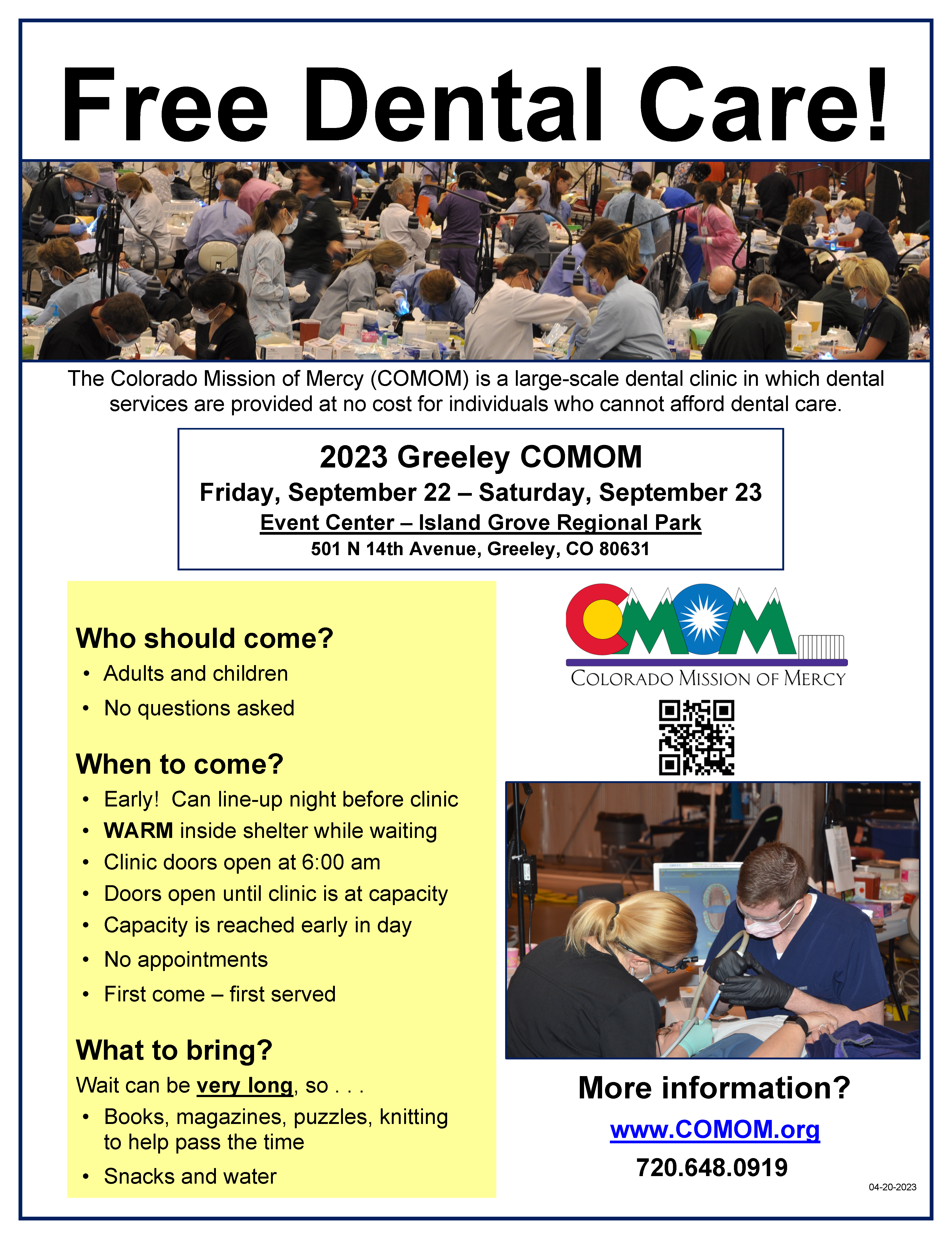 The Colorado Mission of Mercy (COMOM) is a large-scale dental clinic in which dental services are provided at no cost for individuals who cannot afford dental care.