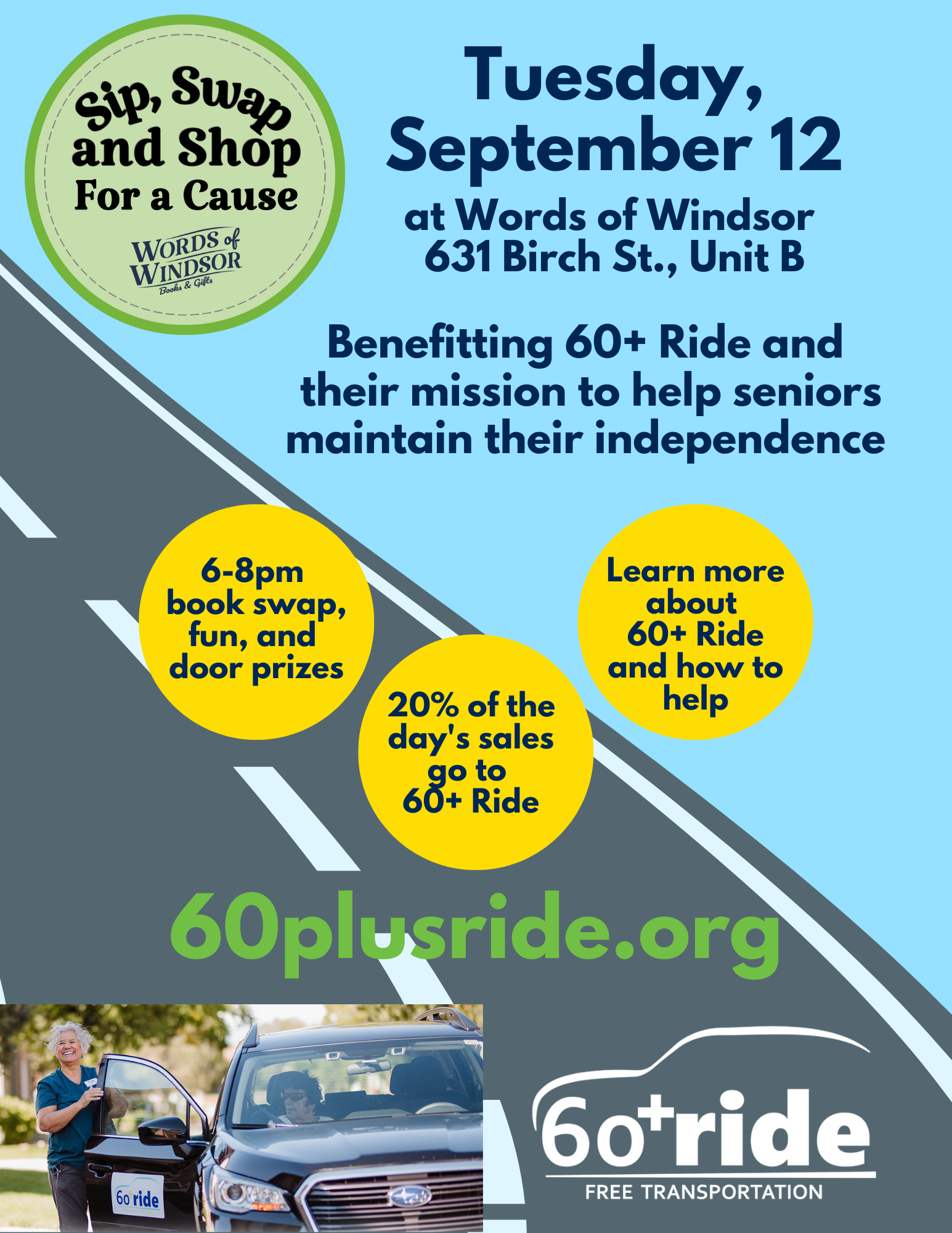 Come Sip, Swap and Shop for a cause at Words of Wisdom, 631 Birch St., Unit B, in Windsor, on Tuesday, September 12 from 6-8 p.m. The event benefits 60+ Ride and their mission to help seniors maintain their independence. Drop by to swap a book, have fun, and take your chances to win a door prize! For more information visit www.60plusride.org.
