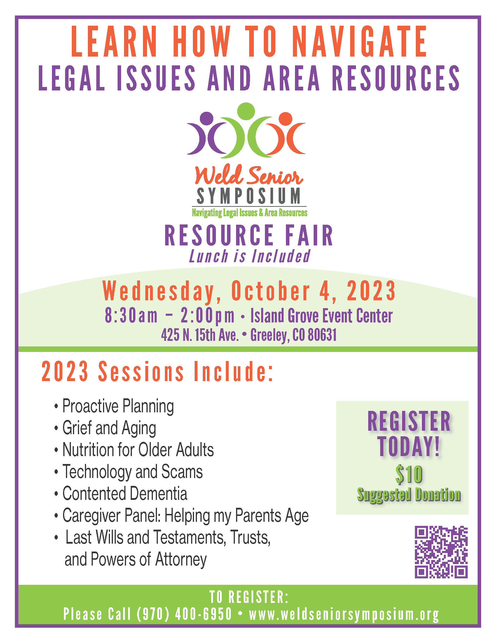 More information and registration can be found at www.weldseniorsymposium.org. Not into the internet? Then please call us and we can register you over the phone by calling (970) 400-6950. A suggested donation of $10 will help cover the cost of lunch and event expenses that can be donated at the door.