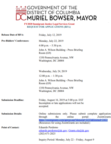 Mayor Muriel Bowser's FY2020 Immigrant Justice Legal Services Grant: Request for Applications (RFA)