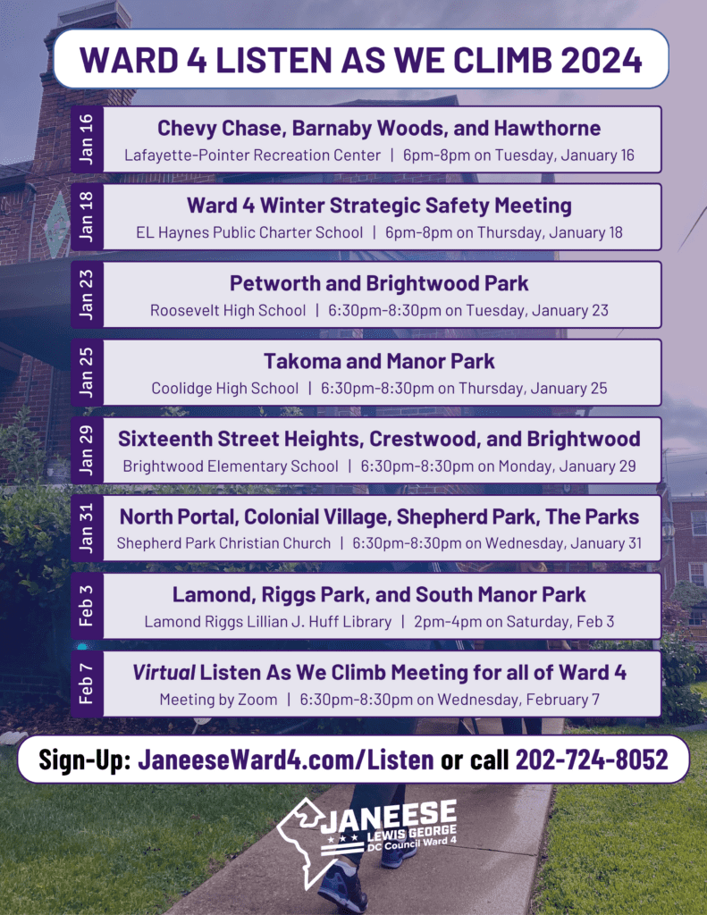 I am looking forward to convening our public safety leaders to hear from our community and discuss solutions at our Ward 4 Strategic Safety Meeting on Thursday, January 18 at 6pm at EL Haynes PCS. Please contact Barbara Rogers at brogers@dccouncil.gov with any questions or requests — including if you need interpretation in Spanish, Amharic, or ASL. This week our community has been responding to several disturbing and traumatizing incidents — including robberies, carjackings, and burglaries — that underscored the need for stronger interventions against crime and improved coordination between our communities and across DC government. Fourth District made several important arrests this week, including arresting the suspect for a stolen vehicle in Sixteenth Street Heights and a carjacking in Manor Park. MPD also arrested a suspect for at least one of the burglaries that took place in Sixteenth Street Heights, and it conducted a traffic safety checkpoint on the 7100 block of Georgia Avenue NW that yielded multiple arrests. I have been in communication with Commander Lavenhouse and neighbors about the urgent need to improve safety in Manor Park. MPD has increased patrols in the neighborhood to deter crime and apprehend suspects when crime occurs, and we are working together to improve lighting in the neighborhood to improve visibility and safety. At the same time, the Council is preparing to vote on comprehensive public safety legislation to address crime that makes more than 100 different interventions across every facet of our criminal justice system. While I am still reviewing the omnibus bill and will examine every provision carefully, there are important changes included that will make it easier to prosecute carjackings and help MPD identify and apprehend more suspects to close cases.