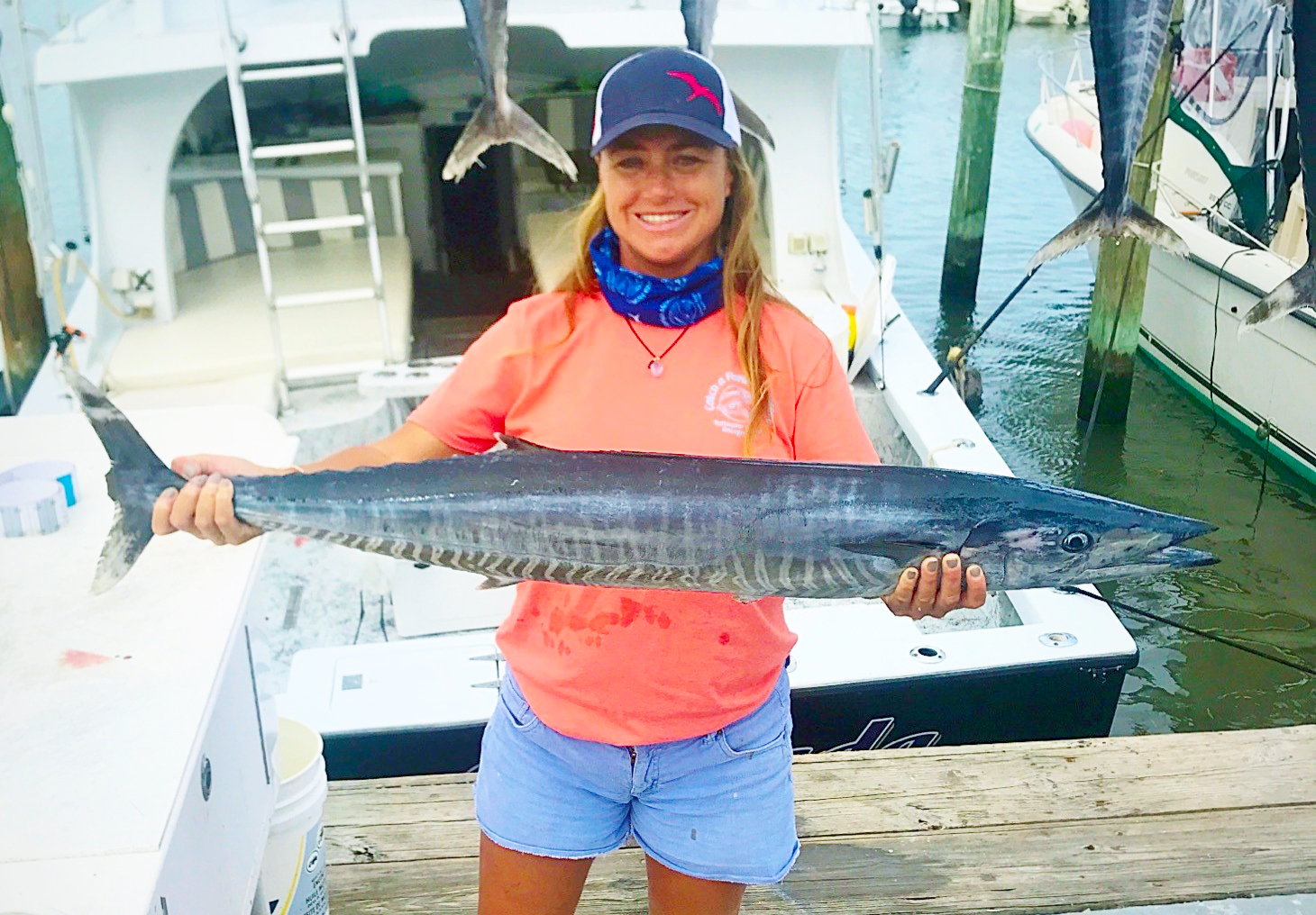 Allision Stattner shows off a wahoo, the 50th fish caught on her Saltwater Fish Life List.