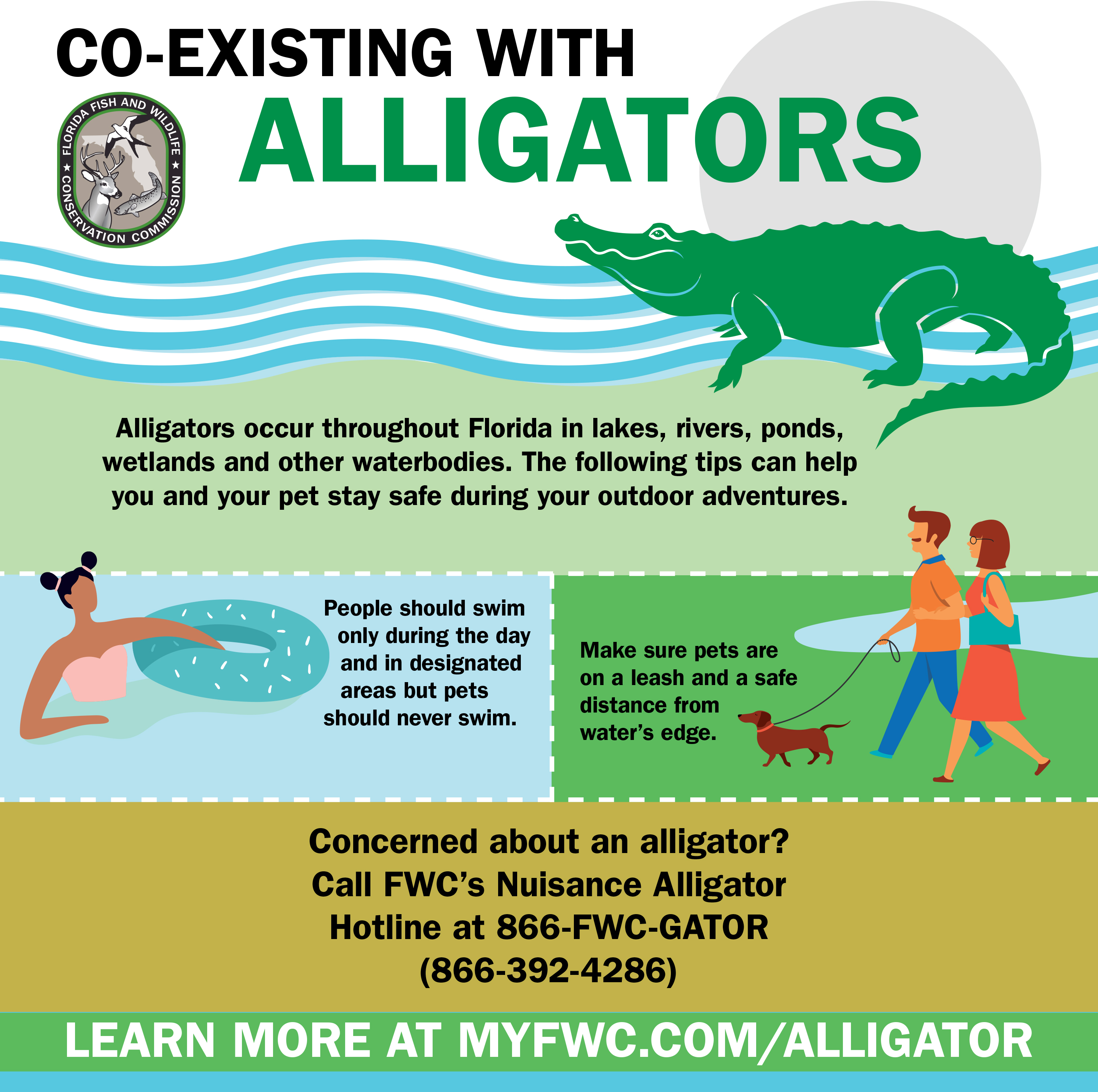 “We wanted to produce a tool with easy-to-remember advice that people could easily share with their friends and family on social media,” said Brooke Talley, FWC’s Alligator Management Program coordinator. “We hope everyone joins us in getting the word out about simple precautions pet owners should take when in or near the water!”