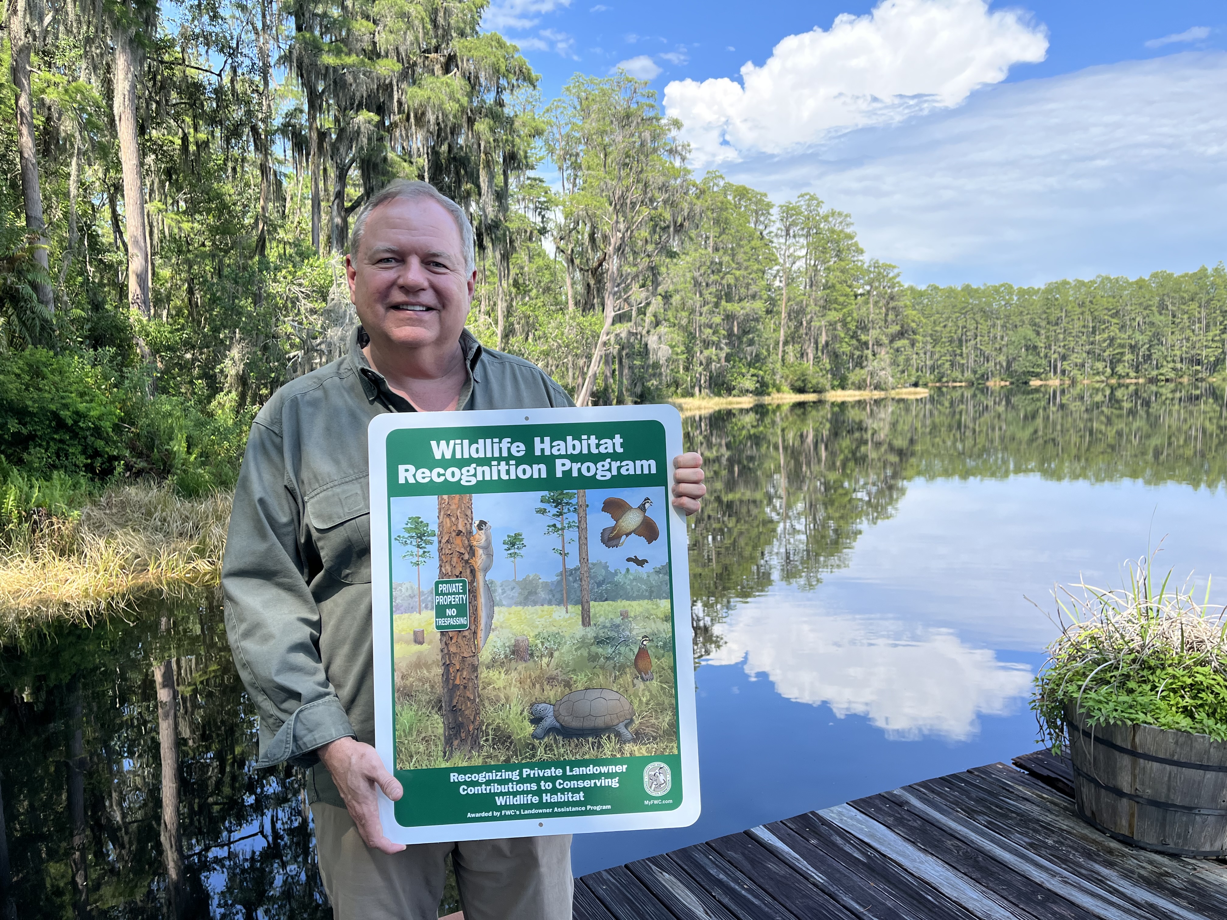 The Florida Fish and Wildlife Conservation Commission (FWC) recently recognized the outstanding wildlife habitat management efforts of private landowner Jake English of Pasco County. The recognition is part of the Wildlife Habitat Recognition Program, meant to formally honor exemplary landowners by gifting them with a sign to display on their property and a certificate recognizing their habitat conservation efforts.